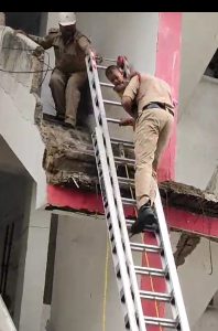 बिल्डिंग की सीढ़ी गिरने से सात घंटे फंसा रहा तीन परिवार