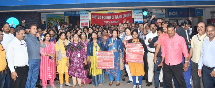 बोकारो. यूनाइटेड फोरम ऑफ बैंक यूनियन के बैनर तले शुक्रवार को सेक्टर 04 स्थित बैंक ऑफ इंडिया शाखा के सामने प्रदर्शन किया गया. ग्राहक सेवा में सुधार के लिए सभी संवर्ग में समुचित बहाली, बैंक प्रबंधन द्वारा लगातार द्विपक्षीय समझौतों का उल्लंघन, सप्ताह में पांच कार्यदिवस समेत अन्य मांग को लेकर प्रदर्शन किया गया. कर्मचारियों ने मांगों के समर्थन में नारा लगाया. आंदोलन 24 व 25 मार्च को आहुत अखिल भारतीय बैंक हड़ताल के समर्थन में किया गया था. यूनियन के जिला उप संयोजक राघव सिंह ने कहा कि बैंकों में कर्मचारियों की संख्या दिन प्रतिदिन घट रही है. इससे एक तरफ ग्राहक सेवा बाधित हो रहा है, वहीं कार्यरत कर्मचारियों पर काम का अत्यधिक बोझ बढ़ता जा रहा है. ऐसे में कर्मी तनाव में जीने को वह अभिशप्त हो गए हैं. कहा कि मांगों पर जल्द से जल्द ध्यान नहीं दिया गया तथा साथ ही डीएफएस के द्वारा बैंकों में अनावश्य हस्तक्षेप को बंद नहीं किया गया तो 24 व 25 मार्च 2025 को दो दिवसीय हड़ताल तो होगी. वक्ताओं ने कहा कि आंदोलन बैंक हित, ग्राहक हित एवं कर्मचारी हितों के रक्षार्थ किया जा रहा है. मौके पर राजेश कुमार ओझा, विभाष झा, राजेश श्रीवास्तव, सुधीर कुमार, वरुण कुमार, मिथिलेश कुमार, राकेश मिश्रा, अवधेश प्रसाद, दिलीप कुमार, रजनीश कुमार, नीरज तिवारी, माणिक दास, अरुण कुमार, प्रशांत कुमार, विवेक ठाकुर आदि उपस्थित थे.
