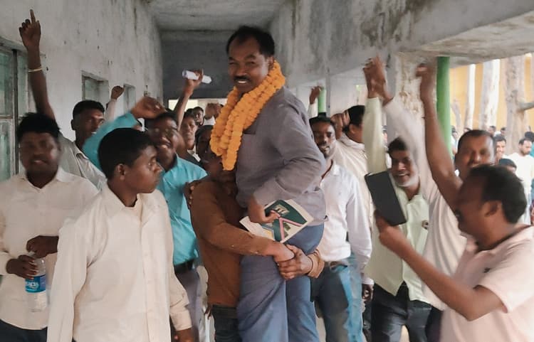 जिला संयोजक मंडली के सामने समर्थकों ने लुदू मांझी को माला पहनाया, कंधे पर घुमाया
