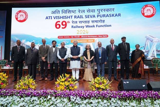 नयी दिल्ली के भारत मंडपम में आयोजित भारतीय रेल के 69वें अति विशिष्ट रेल सेवा पुरस्कार समारोह में केंद्रीय रेल मंत्री अश्विनी वैष्णव ने रेलकर्मियों को सम्मानित किया. यह सम्मान रेलवे सुरक्षा, रखरखाव, गुणवत्ता व प्रशिक्षण पर उनके असाधारण योगदान के लिए दिया गया. समारोह में श्री वैष्णव ने रेलवे की बुनियादी ढांचे के आधुनिकीकरण, यात्रियों को विश्व स्तरीय अनुभव प्रदान करने के लिए सुरक्षा, रखरखाव, गुणवत्ता व प्रशिक्षण में प्रयासों को तीन गुणा करने की आवश्यकता पर जोर दिया. उन्होंने कहा कि सुरक्षा प्राथमिकता बनी हुयी है, शून्य डिरेलमेंट जोन जैसी पहलों में वित्तीय पुरस्कारों से प्रोत्साहित किया जा रहा है. सतत प्रगति सुनिश्चित करने के लिए आधुनिक प्रौद्योगिकी के एकीकरण, नीति सुधार व संरचनात्मक परिवर्तनों पर जोर दिया. उन्होंने सभी पुरस्कार विजेताओं को उनके असाधारण कार्य व प्रयासों की सराहना की. उन्होंने तीव्र निर्माण गति, कश्मीर से कन्याकुमारी रेल लिंक व लंबित उत्तर-पूर्व कनेक्टिविटी की पहल जैसी परियोजनाओं को पूरा करने पर जोर दिया.दपू रेलवे के इन कर्मचारियों को मिला सम्मान