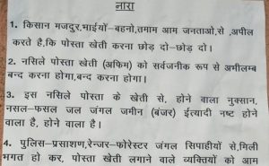 मार्क्सवाद-लेनिनवाद और माओ त्से तुंग जिंदाबाद के स्लोगन के साथ कई गांवों में ऐसे पोस्टर लगाये गये हैं. इससे लोगों में दहशत का माहौल है. नक्सलियों ने ग्रामीणों से कहा है कि अफीम तस्कर, चोर, गुंडा, बदमाश को ग्रामीण जनता मार भगाये. वहीं, एक वनकर्मी ने कहा है कि कुछ दिनों पहले एक वनपाल को नक्सलियों ने बंधक बना लिया था. उससे कहा था कि अफीम की खेती बंद नहीं होनी चाहिए.