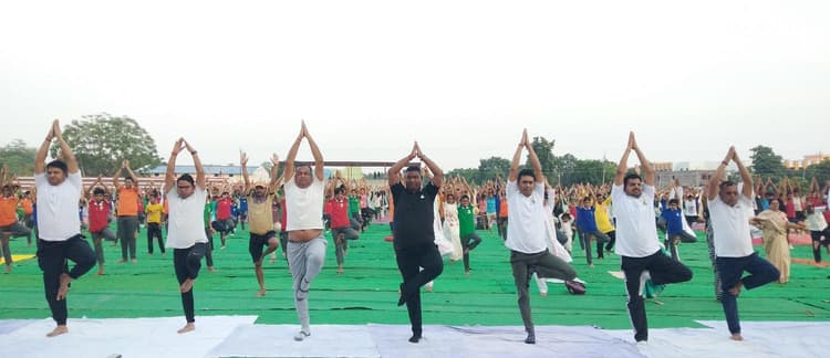चतरा. जवाहरलाल नेहरू स्टेडियम में शुक्रवार की सुबह अंतरराष्ट्रीय योग दिवस पर जिला स्तरीय योगाभ्यास कार्यक्रम का आयोजन किया गया. सुबह छह बजे से आठ बजे तक योगाभ्यास किया गया. मुख्य अतिथि के रूप में राज्य के श्रम नियोजन, प्रशिक्षण एवं कौशल विकास मंत्री सत्यानंद भोगता उपस्थित थे. मंत्री, पदाधिकारी, स्कूली बच्चे व आम लोगों ने एक साथ योगाभ्यास किया. इस दौरान करें योग रहें निरोग का नारा बुलंद किया गया. इस मौके पर मंत्री श्री भोगता ने कहा कि शरीर को अगर स्वस्थ रखना है, तो प्रतिदिन योग करना होगा. नियमित योग करने से बीमार पड़ने की संभावना कम रहती है. मंत्री ने लोगों को निरोग रहने के लिए नियमित योग करने की सलाह दी. कहा कि योग को अपनी दिनचर्या में शामिल करें. मौके पर एसपी विकास कुमार पांडेय, डीएफओ राहुल मीणा, डीडीसी पवन कुमार मंडल, एसी अरविंद कुमार, सिमरिया एसडीओ सन्नी राज, चतरा एसडीओ सुरेंद्र उरांव, जिला खेलकूद पदाधिकारी तुषार राय, जिला सूचना जनसंपर्क पदाधिकारी शकील अहमद, नगर परिषद के कार्यपालक पदाधिकारी विनिता कुमारी समेत काफी संख्या में पदाधिकारी, स्कूली बच्चे व आम लोग शामिल थे.