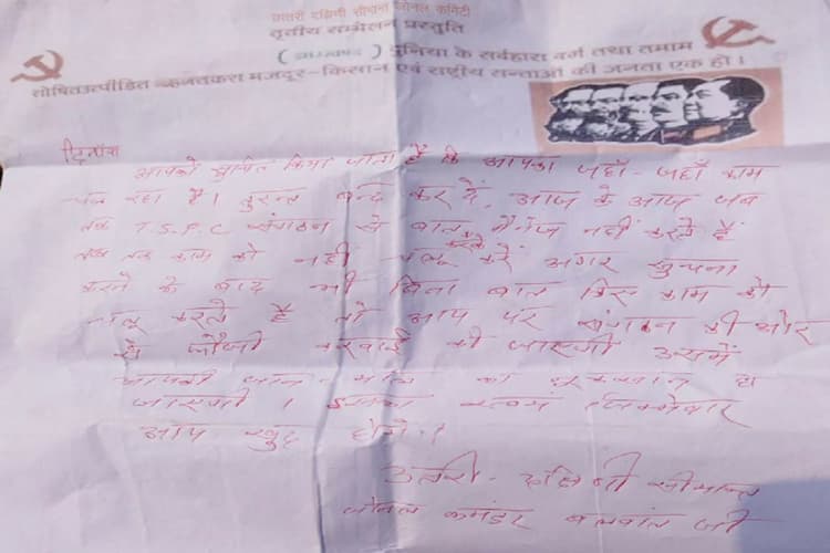 कहा कि टीएसपीसी संगठन से बिना मैनेज किये काम करने पर फौजी कार्रवाई की जायेगी, जिसमें आपका जान माल का नुकसान होगा. कंपनी को सभी कार्य बंद रखने की चेतावनी दी है. घटना से मजदूर डरे सहमे हैं. घटना की सूचना पाकर पुलिस पदाधिकारी दल बल के साथ घटनास्थल पर पहुंचे और पर्चा को जब्त किया. इस संबंध में संवेदक ने थाना में आवेदन दिया है. पुलिस ने संवेदक के आवेदन के आधार पर मामला दर्ज कर उग्रवादियों की धर पकड़ के लिए अभियान शुरू कर दिया है.