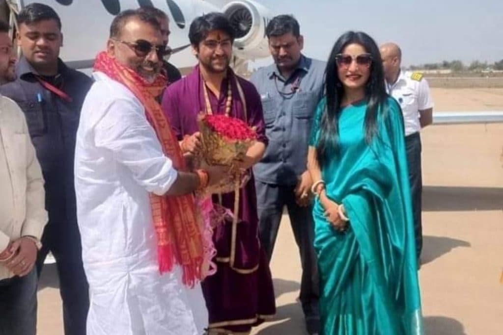 देवघर एयरपोर्ट पर गोड्डा सांसद निशिकांत दुबे व उनकी पत्नी ने बाबा धीरेंद्र कृष्ण शास्त्री का स्वागत किया.