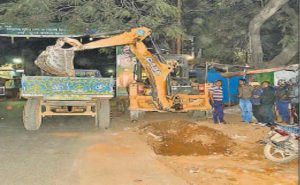 नगर भवन से मंदिर मोड़ तक सड़क किनारे गड्ढे खोदने की वजह से दुर्घटना की आशंका बढ़ गयी है. काम धीमा होने के कारण इन दिनों रोज नगर भवन से मंदिर मोड़ तक जाम लग रही है. अगर बसंत पंचमी के पहले यह सड़क नहीं बन पायी तो यातायात पुलिस के लिए भारी फजीहत होगी.