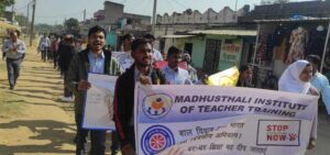 मधुपुर. प्रखंड के सलैया स्थित मधुस्थली शिक्षक प्रशिक्षण संस्थान के छात्र-छात्राओं के द्वारा बाल विवाह मुक्त भारत विषय पर जागरुकता रैली निकाली गयी. बताया जाता है कि झारखंड उच्च व तकनीकी शिक्षा विभाग के निर्देशानुसार चल रहे सौ दिवसीय कार्यक्रमों की कड़ी में मधुस्थली शिक्षक प्रशिक्षण संस्थान की राष्ट्रीय सेवा योजना इकाई की ओर से जागरुकता कार्यक्रम का आयोजन किया जा रहा है. इस कड़ी में बाल विवाह मुक्त भारत विषय पर एक सेमिनार का सफल आयोजन किया गया. इसके उपरांत इसी विषय पर एक पोस्टर मेकिंग प्रतियोगिता का भी आयोजन किया गया. रैली प्रखंड क्षेत्र के टिटहियाबांक, चोंगाखार समेत अन्य गांवों में बाल विवाह मुक्त भारत पर रैली व नुक्कड़ नाटक के माध्यम से जागरूक किया. इसका उद्देश्य ग्रामीण समुदाय को बाल विवाह के दुष्परिणामों के प्रति जागरूक करना था. कार्यक्रम को सफल बनाने में संस्थान की प्राचार्या डॉ. जॉली सिन्हा, एनएसएस समन्वयक विनीता श्रीवास्तव, डॉ अरुण कुमार मिश्रा, पायल दत्ता, प्रिया कुमारी, सुरेश चंद्र जायसवाल, विवेक जायसवाल, संदीप कुमार बेरा, सहेली रॉय, कुंदन कुमार आदि का सराहनीय योगदान रहा.