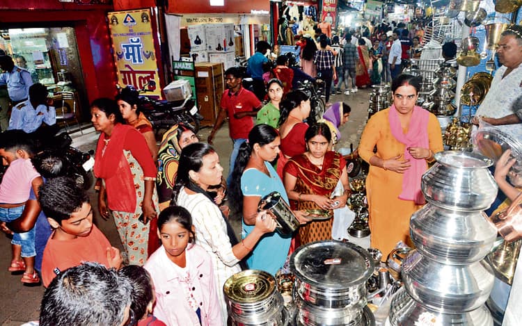 देवघर में बर्तन की दुकानें जगह-जगह चौक-चौराहों में सजी रही. इस वर्ष धनतेरस में ब्रांडेड बर्तन के साथ-साथ देवघर में बनारस, कानपुर व मिर्जापुर के कांसा, पीतल के बर्तन की भी डिमांड रही. दिल्ली, कोलकाता व कानपुर के फैंसी बर्तन के अलावा छठ पूजा में प्रसाद बनाने से लेकर पीतल के सूप की भी खरीदारी हुई. ब्रांडेड कंपनियों के बर्तन में 20 से 25 फीसदी तक डिस्काउंट दिये गये. बाजार में मिक्सी ग्राइंडर, प्रेशर कुकर, थर्मस, केसरोल, फ्राइपेन, तावा, इंडक्शन चूल्हा, माइक्रोवेब ओवेन, किचन कढ़ाई, रोटी मेकर, बर्तन सेट की डिमांड बढ़ गयी है. इस धनतेरस में थर्मोवेयर व नन स्टिक कुकवेयर की डिमांड बढ़ी है. ग्राहकों ने स्टेनलेस स्टील के बर्तन के अलावा मैट (डल) फिनिशिंग और सिल्वर टच फिनिशिंग बर्तनों को पंसद किया.