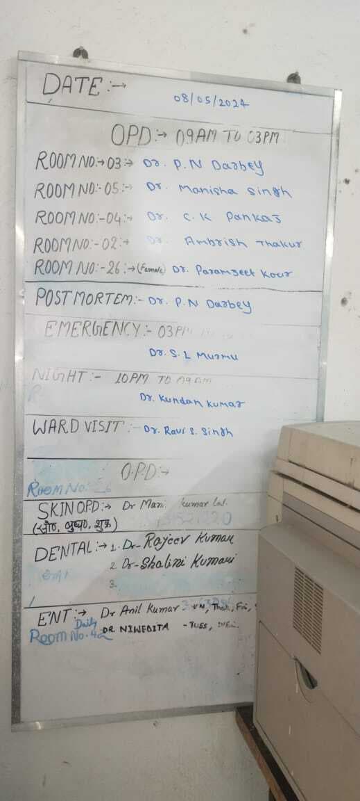 चिकित्सकों व पारा मेडिकल कर्मियों को बायोमैट्रिक पद्धति से हाजिरी बनाने का निर्देश तो दे दिया गया, पर समय निर्धारित नहीं किया गया है. इसका फायदा उठाकर कुछ चिकित्सक ओपीडी के समय सदर अस्पताल आते ही नहीं हैं और कई ऐसे भी हैं जो केवल अपनी उपस्थिति दर्ज कराने पहुंचते हैं. ओपीडी में पांच मिनट बैठ कर अपने क्लिनिक चले जाते हैं. पहले से प्रतिनियुक्त लगभग सभी चिकित्सक सदर अस्पताल के ओपीडी में कभी भी समय पर नहीं नहीं आते हैं. 29 अप्रैल को भी सरकार के प्रधान सचिव अजय कुमार सिंह ने पत्र जारी कर सभी मेडिकल कॉलेज समेत सभी सिविल सर्जन को निर्देश देकर चिकित्सा व पारा मेडिकल कर्मियों से बायोमैट्रिक पद्धति से उपस्थिति बनाने के लिए कहा है, लेकिन समय को नहीं दर्शाया गया है.महिला ओपीडी में 10:30 बजे तक नहीं पहुंची थी महिला चिकित्सक तो सर्जरी और हड्डी रोग विशेषज्ञ भी 10:20 के बाद पहुंचे