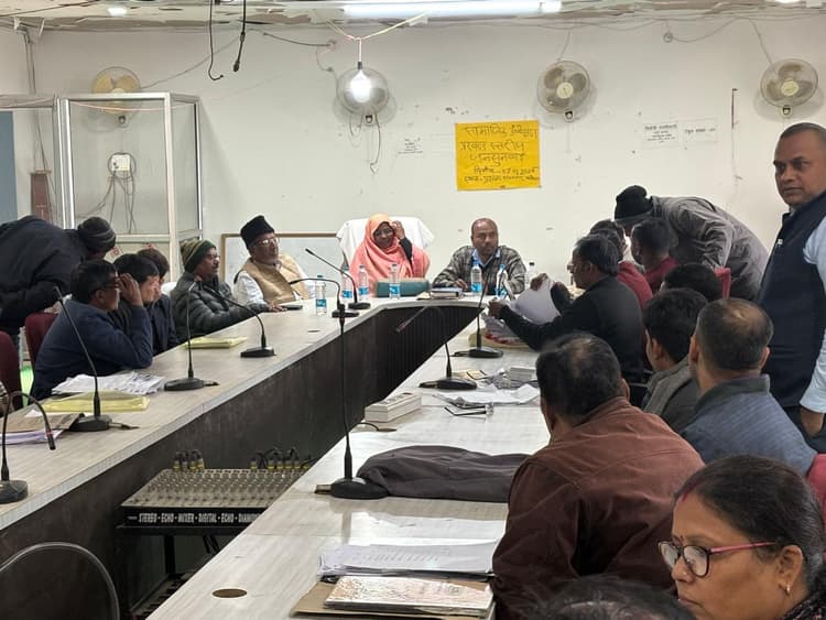 मारगोमुंडा. प्रखंड कार्यालय सभागार में मंगलवार को मनरेगा योजना वित्तीय वर्ष 2020-21-22-23-24 को लेकर हुई पंचायत स्तरीय सोशल ऑडिट को लेकर प्रखंडस्तरीय जनसुनवाई ज्यूरी सदस्यों की उपस्थिति में हुई. इस दौरान प्रखंड क्षेत्र की विभिन्न पंचायतों में 377 मुद्दे को लेकर बारी-बारी से जनसुनवाई की गयी, जिसमें पूर्व में पंचायत स्तरीय में हुई जनसुनवाई में जो साक्ष्य उपस्थित करने का निर्देश दिया गया था. उसका पालन नहीं किये जाने से संबंधित कर्मियों पर जुर्माना लगाया गया. वहीं, इस दौरान पंचायत के अधिकतर योजनाओं प्रखंडस्तरीय जनसुनवाई में कमियों को दुरुस्त करने का निर्णय ज्यूरी सदस्यों द्वारा लिया गया. इस अवसर पर जिले के मनरेगा लोकपाल कल्पना झा ने कहा कि मनरेगा एक्ट में तहत कार्यों का निष्पादन करें. मजदूरों के हितों की अनदेखी कतई नहीं करें. वहीं, अनेकों योजनाएं को जिसका साक्ष्य पाया गया उसे निष्पादित कर दिया गया. इस दौरान मनरेगा योजना में फाइन लगाया गया एवं योजनाओं को प्रखंडस्तर पर सुधार करने का निर्देश दिया गया. मौके पर प्रखंड प्रमुख जुलेखा बीबी, जिला परिषद उपाध्यक्ष प्रतिनिधि इमरान अंसारी, जिला परिषद प्रतिनिधि इदरीश अंसारी, बीडीओ शशि संदीप सोरेन, जिला समन्वयक पंचम वर्मा, प्रखंड समन्वयक यदुमनी तांती, बीपीओ राजाराम प्रसाद, सुनील मुर्मू,जेई आनंद मेहता, मुखिया, पंचायत सेवक, रोजगार सेवक समेत ग्रामीण मौजूद थे. ——————– मारगोमुंडा में मनरेगा योजना को लेकर प्रखंड स्तरीय जनसुनवाई कार्यक्रम आयोजित मनरेगा एक्ट में तहत कार्यों का निष्पादन करें प्रखंडस्तरीय जनसुनवाई की कमियों को करायें दुरुस्त : लोकपाल