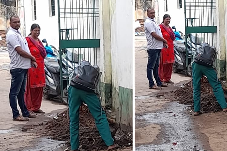 देवघर-दुमका रोड में रिफ्यूजी कॉलोनी स्थित राजकीयकृत मध्य विद्यालय में एक छात्र से स्कूल के बाहर नाला साफ करने का मामला सामने आया है. अभिभावकों का आरोप है कि स्कूल में पढ़ने वाले छात्रों से नाले की साफ-सफाई करायी जाती है. तस्वीर में दिख रहा है कि एक छात्र पीठ पर बैग लेकर नाला की सफाई कर रहा है. वहीं छात्र के सामने प्रभारी प्रधानाध्यापिका व सहायक अध्यापक भी खड़े हैं. एक अभिभावक ने नाम नहीं छापने की शर्त पर बताया कि छात्रों को पढ़ाई के लिए स्कूल भेजा जाता है, लेकिन यहां का माहौल अनुकूल नहीं है. पढ़ाई की जगह बच्चों से नाला साफ कराया जाता है. इस स्कूल में एक से आठवीं कक्षा तक में नामांकित छात्रों की कुल संख्या 209 है तथा नियमित पांच शिक्षक व एक सहायक अध्यापक कार्यरत हैं. स्कूल की प्रभारी प्रधानाध्यापिका कहती हैं कि नाले में जाम गंदगी हटवाई जा रही थी.