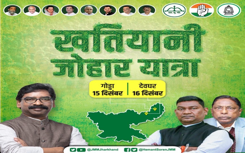 खतियानी जोहार यात्रा की शुरूआत सीएम हेमंत सोरेन ने 8 दिसंबर को गढ़वा से की. उसके बाद 9 दिसबंर को पलामू का दौरा किया. इसके बाद मुख्यमंत्री हेमंत सोरेन 12 दिसंबर को गुमला, 13 को लोहरदगा और आज 15 को गोड्डा व 16 को देवघर में होंगे.