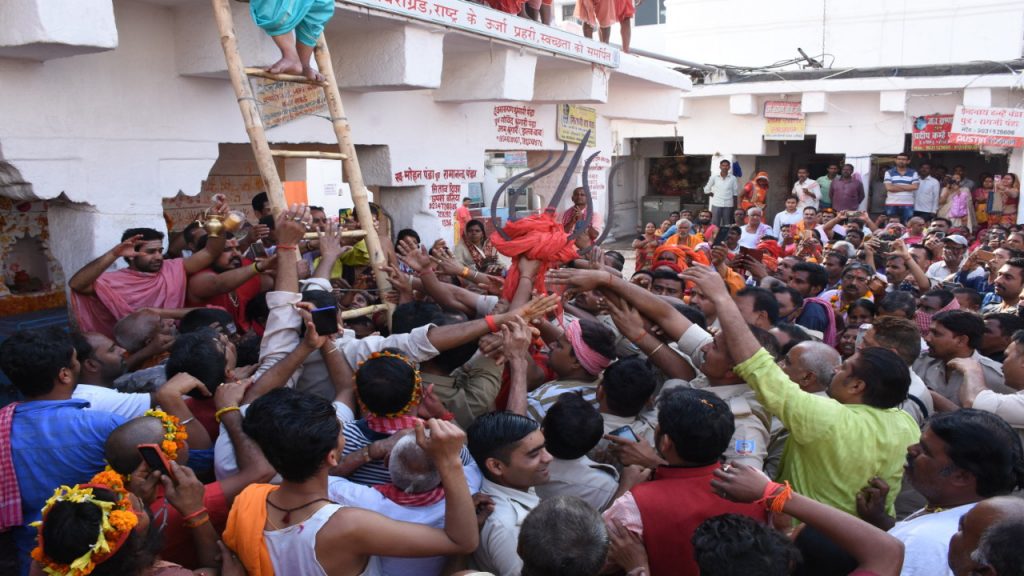 Maha Shivratri 2021, Jharkhand News, Deoghar News, देवघर न्यूज : महाशिवरात्रि को देखते हुए बाबा मंदिर समेत अन्य मंदिरों से पंचशूल उतरते ही पूरा बाबा परिसर हर हर महादेव व जय शिव से गूंजयमान हो गया. पंचशूल को स्पर्श करने में श्रद्धालुओं की होड़ मची है. पंचशूल को स्पर्श करने के लिए पुलिस बल भी खुद को रोक नहीं सके. पंचशूल को उतरने के बाद सीधे प्रशासनिक भवन ले जाया गया. सरदार पंडा ने भी पंचशूल को प्रणाम किये. इसके बाद मंदिर प्रशासनिक भवन की छत पर रख कर सफाई की गयी. पंचशूल खुलते ही बाबा व मां पार्वती के मंदिर शिखर पर लगे गठबंधन धागा लेने के लिए भक्त उमड़ पड़े. भक्त प्रसाद स्वरूप गठबंधन धागा को अपने घर ले जाते हैं.
