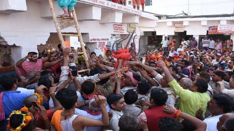 Maha Shivratri 2021, Jharkhand News, Deoghar News, देवघर न्यूज : देवघर स्थित बाबा मंदिर में महाशिवरात्रि से पहले सभी मंदिरों के शिखर से पंचशूल उतार लिया गया है. बुधवार को पूरे विधि-विधान से पंचशूलों की पूजा होगी. मंगलवार को बाबा बैद्यनाथ व मां पार्वती मंदिर के शिखर से पंचशूल उतरा गया. दोपहर करीब साढ़े तीन बजे भोला भंडारी की अगुवाई में भंडारियों की टोली ने पंचशूल को उतारा. इसे उतारने के लिए भंडारी परिवार के चिंतामणी भंडारी, शिवशंकर भंडारी, राजू भंडारी आदि सदस्य बाबा मंदिर के शिखर पर चढ़े. पंचशूल लेकर नीचे उतरते ही इसे स्पर्श करने के लिए भक्तों की भीड़ उमड़ पड़ी.