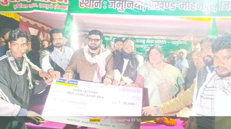 प्रतिनिधि,मोहनपुर. मोहनपुर प्रखंड स्थित जमुनिया गांव में 45वां शहीद सिदो-कान्हू मेला का उद्घाटन अल्पसंख्यक कल्याण मंत्री हफीजुल हसन,विधायक सुरेश पासवान व जिप अध्यक्ष किरण कुमारी ने किया. इस अवसर पर आयोजित दो दिवसीय फुटबाल टूर्नामेंट में विजेता टीम को प्रथम पुरस्कार लकी बॉयस व द्वितीय पुरस्कार काजू बगान, तृतीय पुरस्कार एफसी गादीझोपा, चौथा पुरस्कार एमएससी नरीचा डंगाल की टीम को मुख्य अतिथि मंत्री हफीजुल हसन ने सौंपा. विधायक सुरेश पासवान व जिप अध्यक्ष किरण कुमारी ने भी कप व पुरस्कार देकर सम्मानित किया. मौके पर झारखंड आंदोलनकारी चिह्नित आयोग के सदस्य नरसिंह मुर्मू, झामुमो जिला अध्यक्ष संजय शर्मा, जिला सचिव दिनेश्वर किस्कू, प्रवक्ता सुरेश शाह, जिला उपाध्यक्ष नवल किशोर हेंब्रम, मुखिया अनीता टुडू, युवा नेता श्रीकांत यादव,केदार दास, पुरुषोतम यादव,मोहम्मद नौशाद सूरज झा, लखीराम सोरेन, अरुण शर्मा,वीरेंद्र सोरेन, सुमित सोरेन, विपिन यादव, श्रीसिंह, दिलावर हुसैन इमरान ,रोहित राव, केदार दास, रंजीत यादव, कुंदन राज, दिलीप यादव , सुधांशु मंडल, नंदकिशोर दास समेत दर्जनों लोग उपस्थित थे.