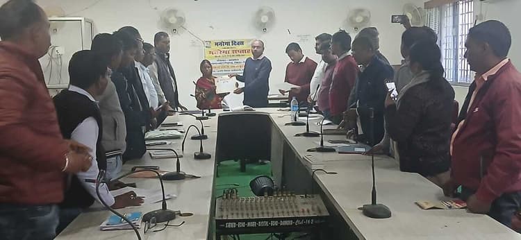मारगोमुंडा. प्रखंड कार्यालय सभागार में शनिवार को बीडीओ शशि संदीप सोरेन की अध्यक्षता में बैठक आयोजित की गयी. बैठक में तीन से आठ फरवरी तक मनाये गये मनरेगा सप्ताह दिवस को लेकर विचार-विमर्श किया गया. साथ ही नये जाॅब कार्ड बनाने से संबंधित आवेदनों का शीध्र निष्पादन करने का निर्देश संबंधित कर्मियों का दिया गया. साथ ही विभिन्न गांवों में आयोजित ग्राम सभा की विस्तृत जानकारी ली गयी. इस दौरान मनरेगा योजना में सौ दिन कार्य पूरा करने वाले मजदूरों को प्रशस्ति पत्र देकर सम्मानित किया गया. मौके पर बीपीओ राजाराम प्रसाद, बीपीआरओ भुवनेश्वर यादव, एइ मुकेश कुमार दास, जेई आनंद मेहता, बबलू कुमार, अजित कुमार मौजूद थे.