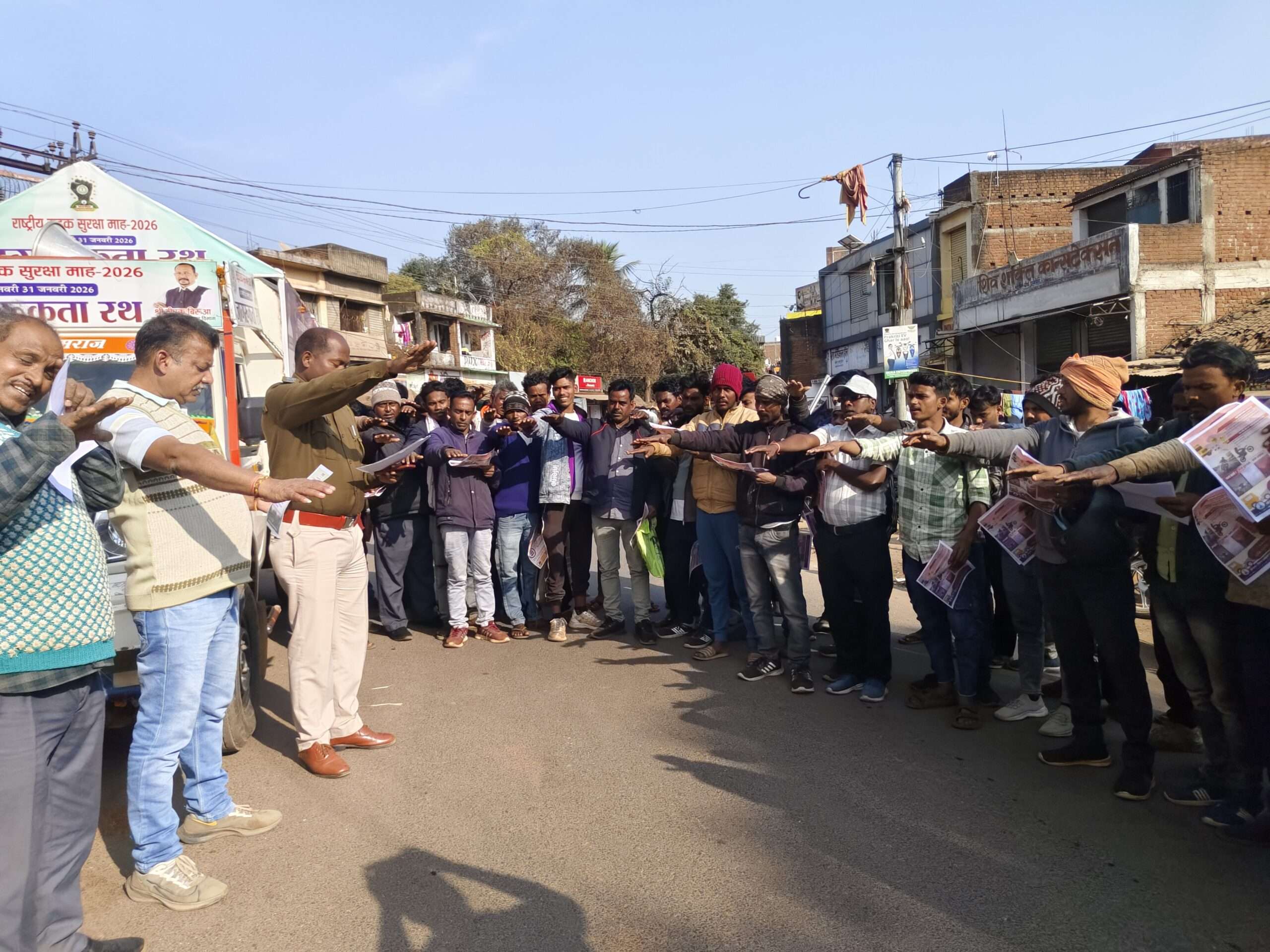 पालोजोरी. डीसी के निर्देश पर जिला परिवहन पदाधिकारी शैलेश प्रियदर्शी के नेतृत्व में सड़क सुरक्षा माह 2026 के10वें दिन शनिवार को सेफ्टी सेटअप डे कार्यक्रम के तहत चलाए जा रहे जागरुकता रथ को ब्लॉक से हरी झंडी दिखाकर रवाना किया गया. इस दौरान प्रखंड सह अंचल कर्मियों ने सड़क सुरक्षा को लेकर सामूहिक रूप से शपथ ली. वहीं, पालोजोरी बाजार में थाना प्रभारी सालो हेंब्रम ने लोगों को सड़क सुरक्षा का शपथ दिलायी. अधिकारियों ने कहा कि जागरूक होकर हम कई लोगों की जान बचा सकते हैं. ज्यादातर सड़क दुर्घटना में मौत का कारण सुरक्षा नियमों की अनदेखी होती है. इसमें मुख्य रूप से हेलमेट नहीं पहना. बिना सीट बेल्ट का चार पहिया वाहन चलाना. शराब पीकर या फोन पर बात करते हुए गाड़ी चलाना, स्पीड ड्राइविंग, 18 साल से कम उम्र के बच्चों द्वारा वाहन चलाना शामिल है. इस लिए लोगों को इससे बचना चाहिए. मौके पर मौजूद अधिकारियों के अलावे अन्य ग्रामीणों ने इसकी शपथ ली.