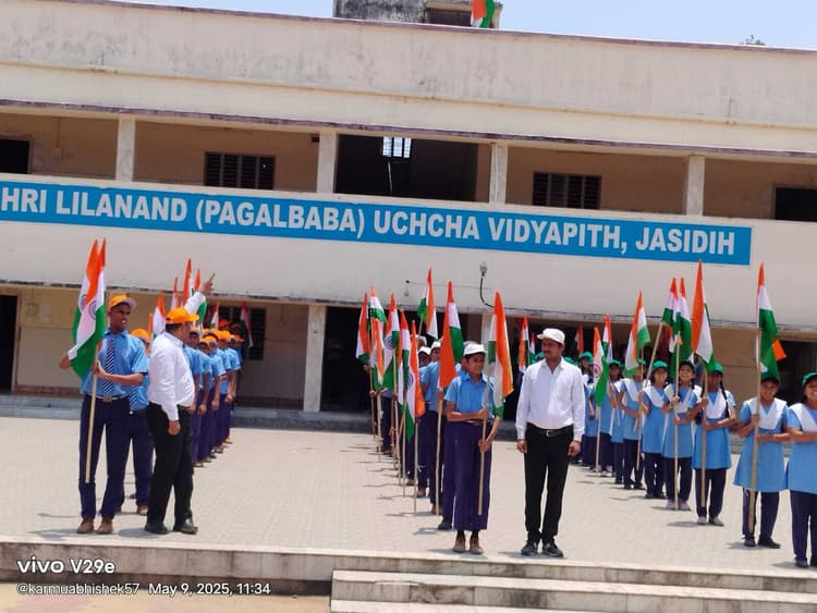 प्रतिनिधि, जसीडीह. जसीडीह के पागलबाबा आश्रम से लगे लीलानंद उच्च विद्यापीठ में शुक्रवार को छात्र-छात्राओं ने देशभक्ति कार्यक्रम आयोजित किया. इस दौरान विद्यार्थियों ने भारत और पाकिस्तान के बीच जारी तनाव में सैन्य कार्रवाई को लेकर भारतीय सेना के समर्थन में सम्मान समारोह आयोजित किया. छात्र-छात्राओं ने सेना को समर्पित देशभक्ति का भाव प्रदर्शित किया. विद्यालय परिसर में विद्यार्थियों व शिक्षकों ने भारतीय सेना के अदम्य साहस, शौर्य और बलिदान को नमन किया, साथ ही देश के प्रति अपनी कर्तव्यनिष्ठा का संकल्प लिया. विद्यालय के प्राचार्य संदीप मिश्रा सहित अन्य ने कहा कि जब हमारे देश में आतंकवाद को जड़ से समाप्त करने के लिए प्रधानमंत्री नरेंद्र मोदी के नेतृत्व में हमारी वीर सेना एक अभूतपूर्व और निर्णायक अभियान में जुटी है. हम सभी भारतीयों का यह धर्म है कि अपने देश के रणबांकुरों के लिए प्रार्थना करें. कहा कि विद्यालय परिवार सभी सेनाओं को सलाम करता हैं. जब हमारे देश की सेना सीमाओं पर देश की रक्षा के लिए लड़ रही है. इस मौके पर उप-प्राचार्य वीरेंद्र कुमार राय,गौतम कुमार,अभिषेक कुमार,सुमन कुमार मिश्रा, सागर कुमार, अमोद कुमार मिश्रा, राजेश कुमार मंडल, मनोज कुमार मालाकार, रीना मिश्रा, रतना कुमारी, दीपक कुमार राय, विक्रम कुमार, प्रभाकर मिश्रा, स्वाति कुमारी, कविता चौधरी, निधि दुबे, शबनम कुमारी, रमिता कुमारी, राजीव रंजन पांडे, रश्मि कुमारी, राधा यादव, रेखा कुमारी, कौशल कुमार झा, पुष्पा कुमारी आदि मौजूद थे.