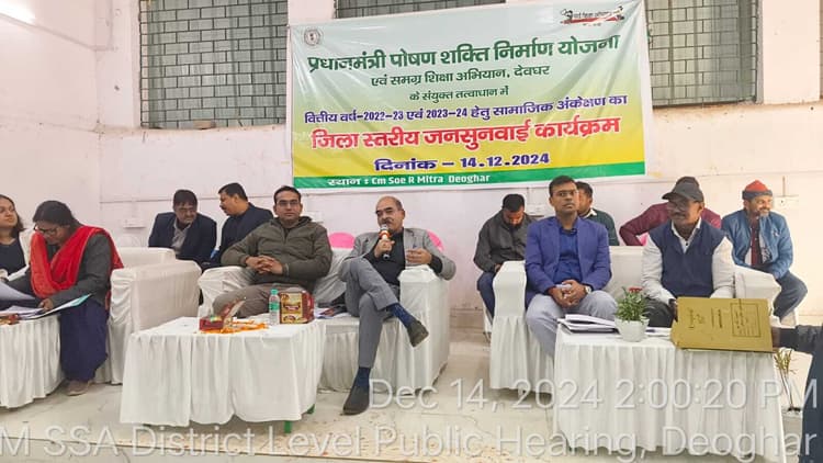 वरीय संवाददाता, देवघर : प्रधानमंत्री पोषण शक्ति निर्माण योजनांतर्गत व समग्र शिक्षा अभियान का वित्तीय वर्ष 2022-23 से 23-24 के सामाजिक अंकेक्षण की जिलास्तरीय जनसुनवाई आरमित्रा प्लस टू स्कूल में की गयी. जनसुनवाई में सर्व शिक्षा अभियान से जुड़े 93 मामले व मध्याह्न भोजन से जुड़े 49 मामलों का निष्पादन किया गया. इनमें अधिकांश प्रखंड स्तर से आये मुद्दे थे, जिसमें विद्यालयों में शिक्षकों कमी को दूर करने व शौचालय के निर्माण कराने का मामले शामिल हैं. इनमें से कुछ मामलों में पूर्व में ही प्राक्कलन तैयार किया गया है, जबकि शेष को स्कूल स्तर पर निष्पादित करने पर सहमति बनी. वहीं मामलों में राज्य से पत्राचार किये जाने की बात कही गयी.