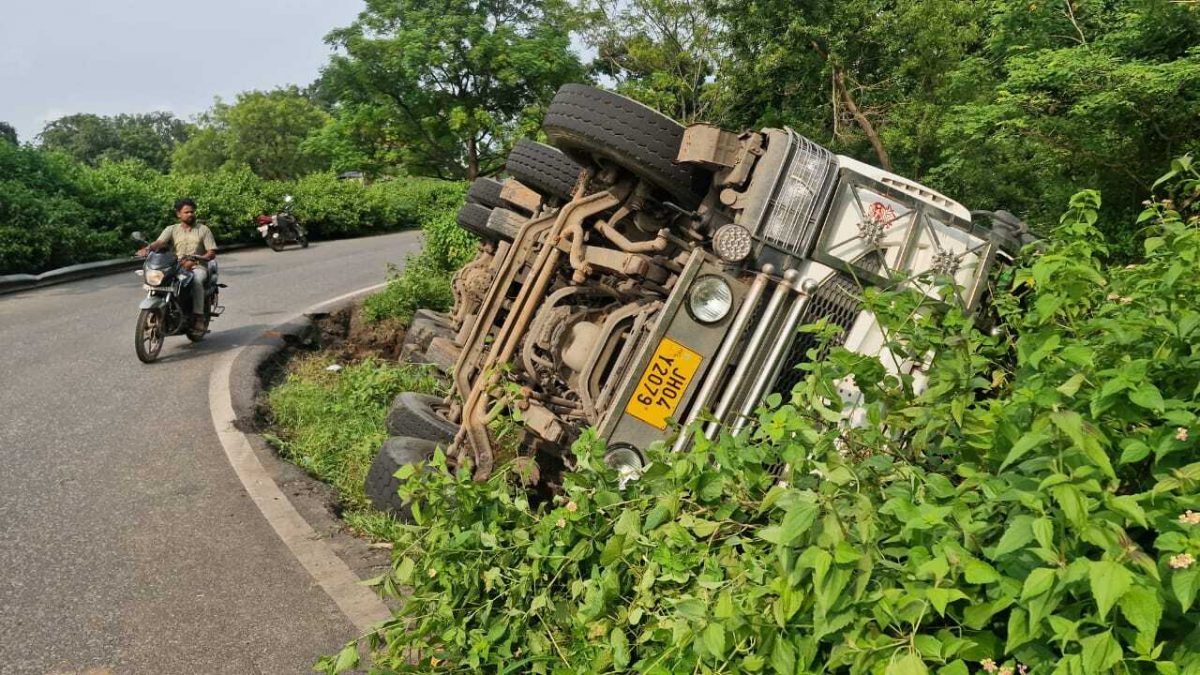 चितरा. थाना क्षेत्र अंतर्गत सहरजोरी गांव के पास तीखी मोड़ पर शुक्रवार को एक ट्रक अनियंत्रण होकर पलट गया. घटना में ट्रक संख्या जे एच 04 वाई 2079 के चालक राहुल पंडित व खालसी के सिर व शरीर पर चोट लगी है. बताया जाता है कि घटना की जानकारी मिलने पर स्थानीय पुलिस ने चालक व खलासी को उठाकर चितरा कोलियरी स्थित औषधालय में प्राथमिक इलाज कराया. वहीं दूसरी ओर बताया जाता है कि जामताड़ा के शतसाल नदी से बालू लेकर सिकटिया के रास्ते करौं प्रखंड के गौरीपुर जा रहा था, कि रास्ते में सहरजोरी गांव के तीखी मोड़ के पास उक्त ट्रक दुर्घटना ग्रस्त हो गया. चालक व खलासी जामताड़ा के आसपास का रहने वाला बताया जाता है.