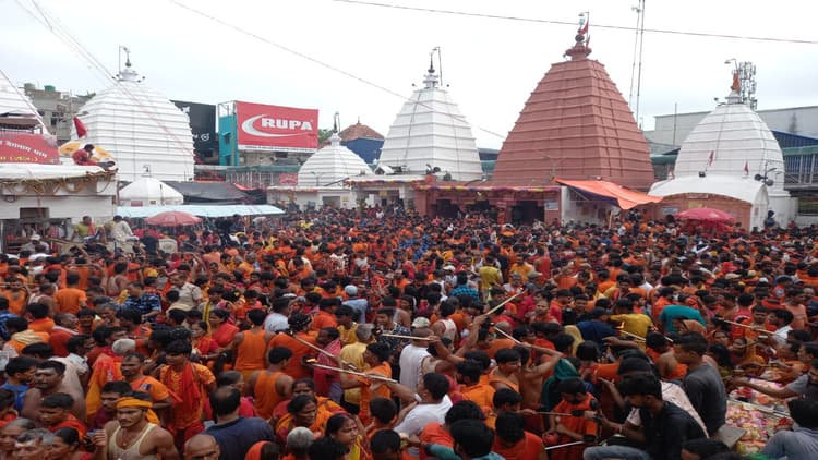 Sawan 2022, Shravani Mela 2022: श्रावणी मेले की पहली सोमवारी पर बाबा धाम में भक्तों का सैलाब उमड़ पड़ा. बाबा पर जलार्पण करने आये कांवरियों की कतार बाबा मंदिर से करीब 12 किलोमीटर दूर कुमैठा स्टेडियम तक पहुंच गयी. वहीं, मां पार्वती मंदिर में जलार्पण कराने वाले भक्तों की कतार मंदिर के पश्चिम द्वार से निकलकर सनबेल बाजार होते हुए सब्जी मंडी के पार तक पहुंच गयी. इस दौरान शाम करीब सात बजे तक पौने दो लाख कांवरियों ने बाबा बैद्यनाथ पर जलार्पण कर मंगलकामना की. इधर, सुबह करीब पौने चार बजे बाह्य अरघा में जलार्पण के लिए कांवरिये आपस में ही धक्का-मुक्की करते दिखे. इसके बाद पुलिस ने तुरंत मोर्चा संभालते हुए कांवरियों को कतारबद्ध तरीके से जलार्पण कराने की व्यवस्था को बहाल किया.