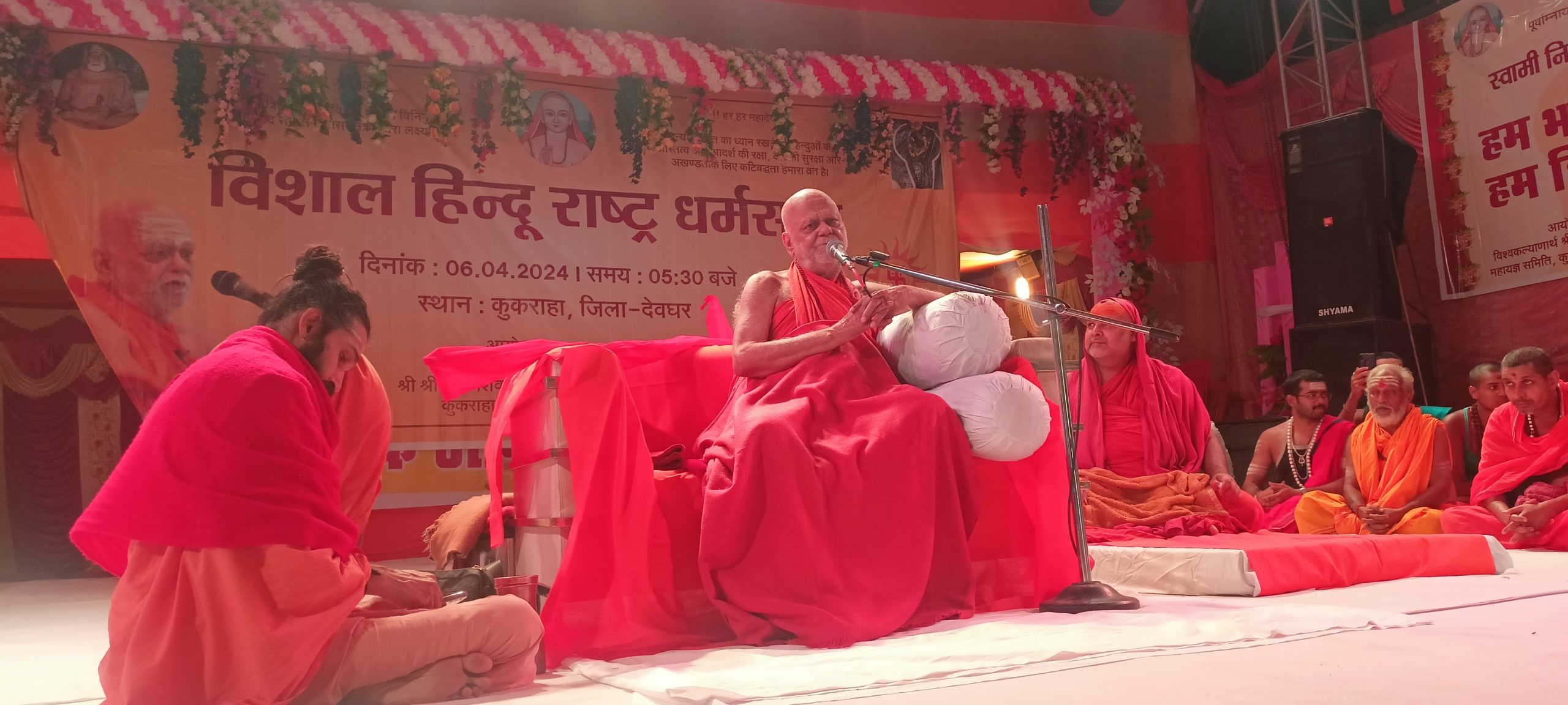 प्रतिनिधि,चितरा: थाना क्षेत्र के कुकराहा में आयोजित श्री 108 शिव शक्ति महायज्ञ के दौरान शनिवार की रात्रि पुरी मठ के शंकराचार्य स्वामी निश्चलानन्द सरस्वती ने विशाल हिंदू राष्ट्र सभा को संबोधित किया. उन्होंने कहा कि भारत की संस्कृति में प्रार्थना की जाती है कि सभी सुखी व संपन्न रहें. हमारे अंदर वसुधैव कुटुंबकम की भावना है. यहां की धरती ने राष्ट्रवीरों, शूरवीरों, मनीषियों, देवताओं को जन्म दिया है. भारत पूरे विश्व का हृदय है, कण कण में ईश्वर का वास है. विश्व की कोई ताकत भारत को अस्त व्यस्त नहीं कर सकती है. धर्म और राजनीति को एक दूसरे का पूरक बताते हुए कहा कि आज की राजनीति दिशाहीन है, सत्तालोलुपता हावी और प्रभावी है.