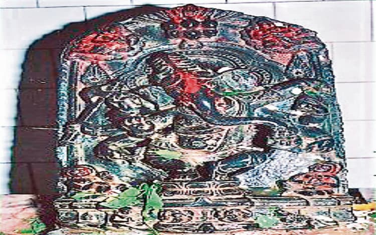 भगवान गणेश के शिखर पर तांबे का कलश है. इसके ऊपर पंचशूल लगा है. शिखर के गुंबद के नीचे नीले रंग से रंगा हुआ है. इस मंदिर में प्रवेश करने के लिए मंदिर प्रांगण से तीन सीढ़ियां पार करके भक्त भगवान गणेश के प्रांगण में पहुंचते हैं. सामने के दरवाजे को भक्त प्रणाम कर सिर झुका कर गर्भगृह में प्रवेश करते हैं. जहां भगवान गणेश की मनोहारी, आकर्षक कसौटी पत्थर की काले रंग की मूर्ति स्थापित है. यह मूर्ति दो फीट ऊंची है. यहां पर भगवान गणेश की वैदिक विधि से पूजा की जाती है.