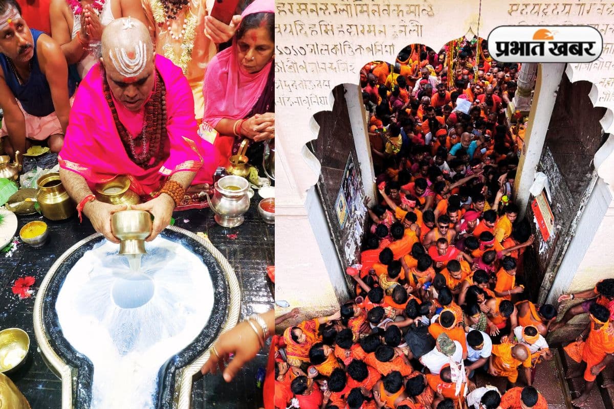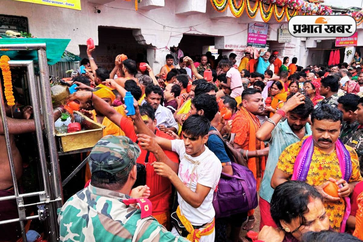 shravani mela 2025: श्रावण की पहली सोमवारी को बाबा बैद्यनाथ का करीब सवा दो लाख श्रद्धालुओं ने जलाभिषेक किया. पहली सोमवारी पर देवघर में श्रद्धालुओं का सैलाब उमड़ पड़ा. 12 किलोमीटर लंबी कतार लग गयी. बाबा मंदिर के मुख्य अरघा और बाह्य अरघा से जलार्पण कर बाहर निकलने वाले कांवरियों को पार्वती मंदिर की कतार में भेजने के लिए रस्सी के सहारे बड़ी संख्या में पुलिस बल की तैनाती की गयी थी, लेकिन जैसे ही कांवरिये पार्वती मंदिर से बाहर निकलते, अव्यवस्था बढ़ जाती.