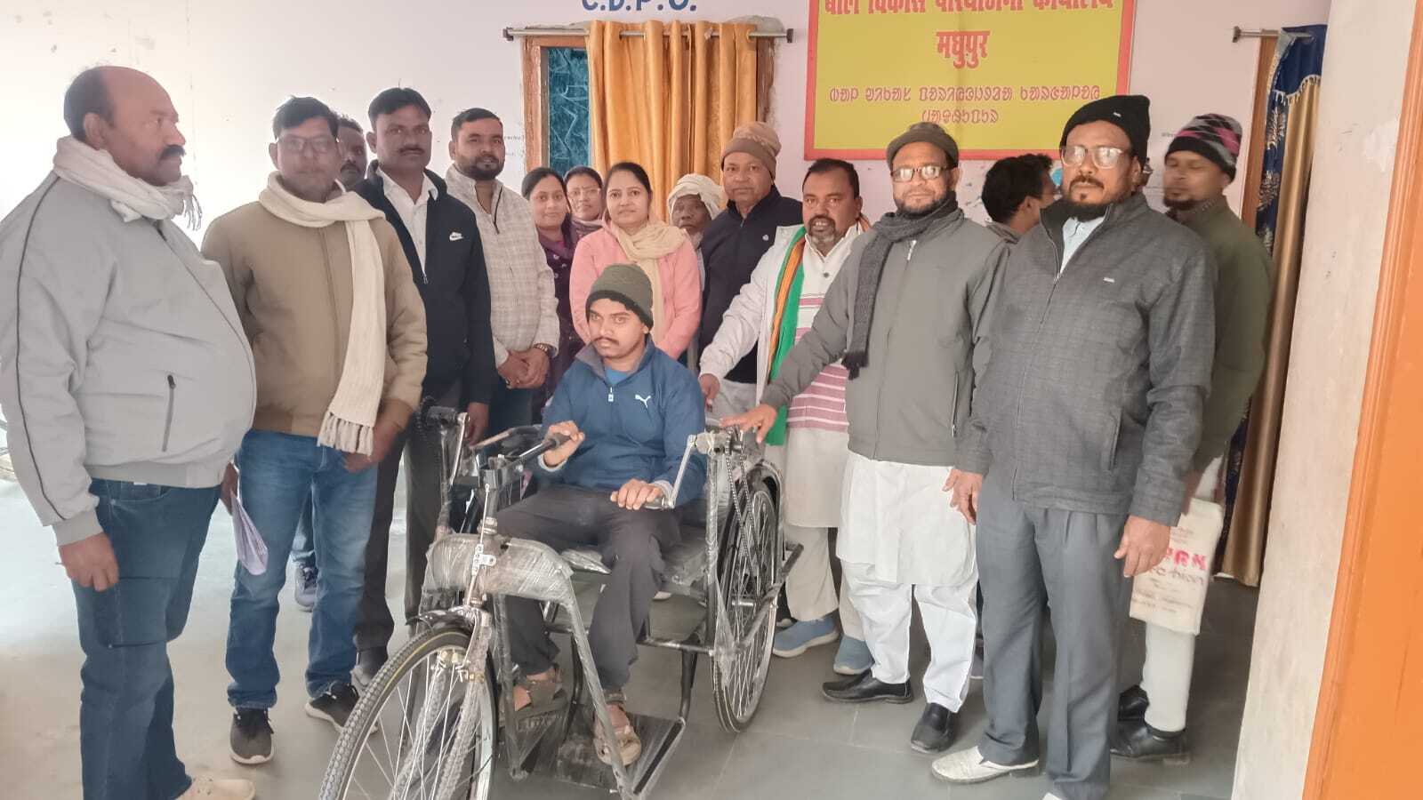मधुपुर. प्रखंड कार्यालय परिसर स्थित बाल विकास परियोजना कार्यालय में मंगलवार को सीडीपीओ नीतू कुमारी ने प्रखंड के दो दिव्यांगों के बीच ट्राइसाइकिल वितरित की. मौके पर सीडीपीओ ने कहा कि दर्वे पंचायत के झिलवा निवासी मुबारक अंसारी व बुढ़ैई पंचायत के नवादा निवासी मनोज यादव को विभाग की ओर से ट्राइसाइकिल दी गयी. उन्होंने कहा कि ट्राइसाइकिल मिलने से उन्हें आवागमन में होने वाली कठिनाइयों से काफी हद तक राहत मिलेगी. कहा कि राज्य सरकार दिव्यांगों व जरूरतमंदों को कल्याण के लिए निरंतर योजनाएं चला रही है. कल्याण विभाग के माध्यम से ट्राइसाइकिल, व्हीलचेयर समेत अन्य सहायक उपकरण उपलब्ध कराया जा रहा है. ताकि दिव्यांगजनों को सम्मानजनक जीवन जीने में सुविधा मिल सके. उन्होंने कहा कि आंगनबाड़ी सेविका व जनप्रतिनिधियों से अपील की है कि वे अपने क्षेत्रों में ऐसे जरूरतमंद दिव्यांग व्यक्तियों की पहचान कर सूची तैयार कर इस योजना का लाभ दिलायें. मौके पर जिला परिषद सदस्य फारूक अंसारी, साकीर अंसारी, अबू तालिब अंसारी, दिनेश्वर किस्कू, मुख्तार अंसारी, अब्दुल मजीद अंसारी, पर्यवेक्षिका प्रियंका कुमारी, अनिता कुमारी, सालंती हेंब्रम, प्रकाश दास, टिंकू दास आदि मौजूद थे.