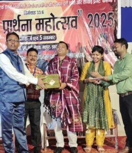 मधुपुर. शहर के भेड़वा मोहल्ला स्थित पीएच मिशन चर्च परिसर में चल रहे दो दिवसीय क्रिश्चियन फैलोशिप मधुपुर के तत्वाधान में आयोजित सामूहिक प्रार्थना सभा के बाद गुरुवार को अतिथियों को सम्मानित किया गया. इस अवसर पर ओडिशा के संबलपुर से आये मुख्य वक्ता प्रदीप लुगुन व सुमती तिरु को फादर विश्वनाथ यादव, विजय सिंह व प्रभु जॉन हांसदा ने संयुक्त रूप से शॉल ओढ़ाकर सम्मानित किया. साथ ही कार्यक्रम के सफल संचालन करने वाले अन्य अतिथियों को भी सम्मानित किया गया. दो दिवसीय प्रार्थना महोत्सव में प्रभु यीशु की जीवनी के संबंध में उपस्थित लोगों को जानकारी दी गयी. प्रार्थना सभा के उपरांत गीत, संगीत आदि कार्यक्रम का आयोजन किया गया. इस अवसर पर ओड़िशा के संबल से आये मुख्य वक्ता प्रदीप लुगुन ने कहा कि प्रभु यीशु ने इस दुनिया में एक प्रकाश के रूप में आकर लोगों को स्वस्थ करने काम किया है. आज लोग असाध्य रोग से पीड़ित है वैसे लोगों के लिए विशेष प्रार्थना की गयी. उन्होंने कहा कि जब हम सच्चे मन से प्रभु को याद करते हैं तो यह सभी रोग दूर हो जाता है. उन्होंने कहा कि प्रभु यीशु के मात्र दर्शन से शरीर से सभी पीड़ा दूर हो जाती है. प्रार्थना महोत्सव में झारखंड, बिहार, बंगाल से सैकड़ों श्रद्धालु शामिल हुए थे. मौके पर थियोफिल मुर्मू, अनिता सुब्बा, सपन विश्वास, अभिषेक लाकड़ा, शीला पोडराज, मालोती मुर्मू, रीता दास, रानू सिंह, राजू मसीह, दिलीप सिंह सुमित आदि मौजूद थे. हाइलार्ट्स : चर्च में अतिथियों को किया गया सम्मानित