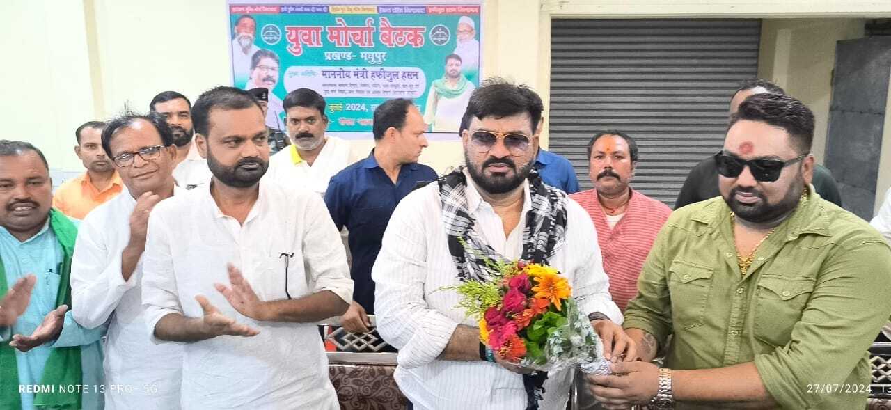 पथलचपटी स्थित एक होटल सभागार में शनिवार को झामुमो प्रखंड युवा मोर्चा की बैठक प्रखंड अध्यक्ष मो अख्तर की अध्यक्षता में हुई. इस दौरान मुख्य अतिथि मंत्री हफीजुल हसन, जिलाध्यक्ष संजय शर्मा व युवा मोर्चा जिला अध्यक्ष राहुल चंद्रवंशी मौजूद थे. मंत्री ने कहा कि दो माह के बाद झारखंड में चुनाव की घोषणा होने वाली है. मधुपुर विधानसभा क्षेत्र हॉट सीट बन चुका है. लगातार हो रहे विकास कार्यों से विपक्ष पूरी तरह से बौखला गया है. उन्होंने कहा कि युवा कार्यकर्ता मेरे सिपाही बनकर क्षेत्र में सरकार की योजनाओं को जन-जन तक पहुंचायें. एक बार फिर से चुनाव में मजबूती के साथ जीत दर्ज कर मुख्यमंत्री हेमन्त सोरेन को बनाना है. पिछले पांच सालों में भाजपा ने झूठा आरोप लगाकर हेमंत सोरेन को परेशान किया है. केंद्र सरकार द्वारा प्रधानमंत्री आवास योजना में राशि नहीं दी जा रही है. एक लाख साठ हजार करोड़ रॉयल्टी का पैसा केंद्र नहीं दे रहा है. सुप्रीम कोर्ट के आदेश से अब खनिज की रॉयल्टी राज्य सरकार को ही मिलेगी. इस राज्य में काफी विकास कार्य होगा. कहा कि जाति धर्म से ऊपर उठकर क्षेत्र के विकास के लिए कार्य करते रहेंगे. नगर विकास विभाग से मधुपुर शहरी क्षेत्र में 50 करोड़ की विभिन्न योजनाएं जल्द लायी जायेंगी. सरकार द्वारा 21 साल से ऊपर की महिलाओं के पेंशन में जो भी दिक्कतें आ रहीं हैं उसे जल्द सुलझा लिया जायेगा. विधानसभा क्षेत्र के विभिन्न प्रखंडों में सड़कों का जाल बिछाया जा रहा है. चुनाव के लिए कार्यकर्ताओं को तैयार रहना है. मौके पर अल्पसंख्यक मोर्चा जिला अध्यक्ष अबू तालिब अंसारी, जिला सचिव दिनेश्वर किस्कू, नगर अध्यक्ष जय प्रकाश मंडल, रजनी मुर्मू, सोनी खान, प्रखंड़ अध्यक्ष साकिर अंसारी, जिप सदस्य फारुख अंसारी, मोरिफ खान, मो. शाहिद, शशि दास, सुबल दास, सरफराज अहमद, समीर आलम, जुगल यादव आदि मौजूद थे.—————————————-झामुमो युवा मोर्चा की बैठक में मंत्री ने कार्यकर्ताओं का बढ़ाया उत्साह
