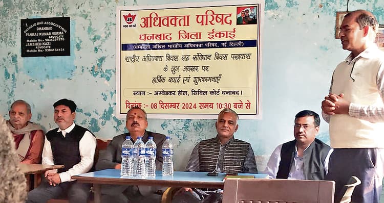 अधिवक्ता परिषद झारखंड, धनबाद इकाई की ओर से रविवार को बार परिसर स्थित अंबेडकर हॉल में अधिवक्ता दिवस सह संविधान दिवस मनाया गया. इसमें भारतीय संविधान में अधिकारों व कर्तव्यों के समन्वय विषय पर चर्चा की गयी. मुख्य अतिथि के रूप में बार काउंसिल ऑफ इंडिया के सदस्य प्रशांत कुमार सिंह, विशिष्ट अतिथि के रूप में झारखंड बार काउंसिल के चेयरमैन राजेंद्र कृष्ण, झारखंड बार काउंसिल के उपाध्यक्ष राजेश शुक्ला व वरिष्ठ अधिवक्ता हरीश जोशी उपस्थित थे. मंच संचालन प्रेम प्रकाश उपाध्याय व धन्यवाद ज्ञापन पंचानन सिंह ने किया. कार्यक्रम में आर्थिक रूप से कमजोर नागरिकों के लिये निःशुल्क न्याय व्यवस्था पर चर्चा की गयी. इसमें जिला अध्यक्ष मनोज कुमार राकेश, शिवशंकर चौधरी, हीरालाल चौहान, अनूप कुमार साव, कमल कुमार गुप्ता, विजय पांडेय, शिवशंकर तिवारी, राजू कुमार, कृष्ण कुमार सिन्हा, राजेन पॉल, नरेंद्र त्रिवेदी, अभिजीत मुखर्जी, संगीता कुमारी आदि उपस्थित थे.