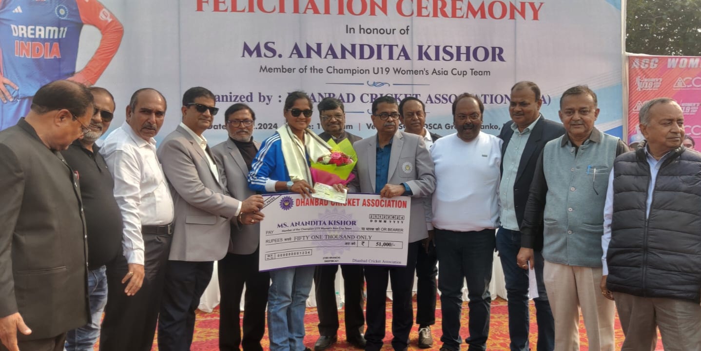Dhanbad News:धनबाद क्रिकेट एसोसिएशन ने बुधवार को कांको स्थित जेएससीए-एसडीएससीए स्टेडियम में इंडिया अंडर 19 महिला क्रिकेट टीम में चयनित धनबाद की खिलाड़ी आनंदिता किशोर को सम्मानित किया. आनंदिता को डीसीए की ओर से 51 हजार रुपये का चेक व शाॅल दिया गया. इस दौरान डीसीए के अध्यक्ष मनोज कुमार सिंह ने कहा कि धनबाद के लिए यह बड़ी उपलब्धि है. आनंदित ने डीसीए व धनबाद को गौरवान्वित किया है. उन्होंने कहा कि आनंदिता की इस उपलब्धि से अन्य महिला खिलाड़ियों का हौसला बढ़ेगा. जेएससीए के कार्यकारिणी सदस्य बिनय कुमार सिंह व डीसीए के महासचिव उत्तम विश्वास ने आनंदिता को बधाई दी. इस दौरान डीसीए के कोषाध्यक्ष ललित जगनानी, बैंक मोड़ चेंबर अध्यक्ष प्रमोद गोयल, धनबाद बार एसोसिएशन के अध्यक्ष अमरेंद्र कुमार सहाय, अधिवक्ता शिव शक्ति प्रसाद, शांतनु चौधरी, जावेद खान, रियाज खान, राजन सिन्हा, धनबाद बिल्डर्स एसोसिएशन के अशोक पांडेय, प्रमोद अग्रवाल, धीरज सिंह, बिनोद कुमार, परिमल सिंह, धनबाद जिला चेंबर के सचिव अजय नारायण लाल, डीसीए के एसएन सिंह, जेके नय्यर, साधवेंद्र सिंह, रविजीत सिंह डांग, अशोक सिंह, अशोक चौरसिया, जितेंद्र कुमार सिंह आदि उपस्थित थे.