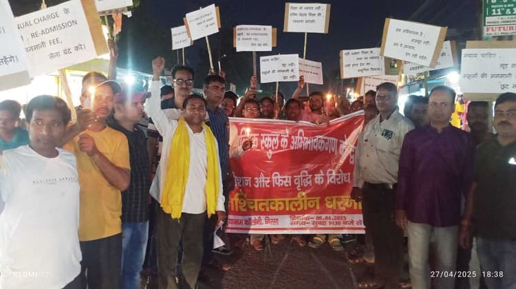 Dhanbad News: मुगमा डीएवी स्कूल प्रबंधन के खिलाफ अभिभावकों द्वारा री-एडमिशन फी व अन्य फी वृद्धि के विरोध में अभिभावकों द्वारा निरसा बाजार दुर्गा मंदिर प्रांगण से कैंडल मार्च निकाला गया. उसमें सैकड़ों की संख्या में अभिभावक शामिल हुए. पूर्व मुखिया रोबिन धीवर के नेतृत्व में कैंडल मार्च में शामिल अभिभावकों ने कहा कि डीएवी प्रबंधन शिक्षा मंत्री का आदेश नहीं मान रहे हैं. हमलोग भी चरणबद्ध आंदोलन कर रहे हैं, जब तक हमारी मांग पूरी नहीं होगी, आंदोलन जारी रहेगा. ज्ञात हो कि पूर्व मुखिया के नेतृत्व में अभिभावकों का धरना पिछले 20 दिन से जारी है. मौके पर आरपी शर्मा, चंदन दत्त, शिबू मंडल, श्याम रजक, वंशीधर सिंह, सुदामा राम, देवाशिष्ठ गोराईं, सुजीत पांडेय, पप्पू हालदार, राजकुमार रविदास, अजय कुमार, राजू कुमार, दिलीप कुमार झा, नौशाद अंसारी आदि शामिल थे.