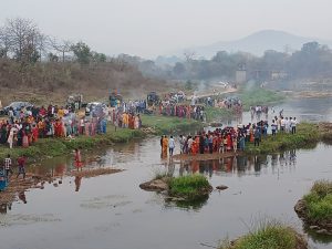 जमुनिया नदी में अर्घ्य देते व्रती व श्रद्धालु.
