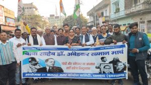 Dhanbad News : कतरास, निरसा व टुंडी में कांग्रेसियों ने निकाला विरोध मार्च देश के गृहमंत्री अमित शाह द्वारा राज्यसभा में बाबा भीमराव आंबेडकर के खिलाफ की गयी टिप्पणी के खिलाफ जय बापू, जय भीम, जय संविधान अभियान के तहत शनिवार को शनिवार जिले के कतरास, चिरकुंडा और टुंडी में कांग्रेसियों ने विरोध मार्च निकाला. कतरास कांग्रेस कार्यालय से निकाला गया र्च शहर की प्रमुख मार्गों का भ्रमण करते हुए गुहीबांध बस पड़ाव पहुंचा. वहां आंबेडकर की प्रतिमा पर माल्यार्पण किया गया. इस दौरान पूर्व मंत्री जलेश्वर महतो ने कहा कि यह अभियान गृहमंत्री के माफी नहीं मांग तक जारी रहेगा. मौके पर बलराम महतो, सरफुद्दी अंसारी, रंजीत कुमार पांडेय, अशोक लाल, शकील अहमद, मासूम खान, माधव सिंह, माला झा, राजेश्वर सिंह यादव, राजाराम यादव, दक्षिणेश्वर कुम्भकार, रोबिन पाल, जियाउल हक, सीमा झा, विनोद शर्मा, सुबोध बर्मन, रोहित वाहिद, अजय पासवान, मो सलाउद्दीन आदि थे. वहीं चिरकुंडा नगर कांग्रेस कमेटी ने चिरकुंडा आंबेडकर चौक से पदयात्रा निकाली. पदयात्रा में जिलाध्यक्ष संतोष सिंह, कार्यकारी अध्यक्ष राशीद रजा, सुरेश चंद्र झा, मो अमीरुल्लाह, शशिभूषण नाथ तिवारी, बबलू दास, निशिकांत मिश्रा, जितेंद्र मिश्रा, परमानन्द सिंह, शंकर गुप्ता, मंतोष यादव, लालबाबू सिंह, सहदेव यादव, खैर मोहम्मद, श्यामाकांत मिश्रा, अरविंद कुमार, स्वराज मिश्रा, बबलू तिवारी, विनय सिंह, श्यामापदो घोष, बिरजू सिंह, राम इकबाल साव, हारून रशीद आदि थे. इधर, टुंडी प्रखंड कांग्रेस कमेटी द्वारा बाबा साहब डॉ भीमराव आंबेडकर सम्मान मार्च निकला गया. मार्च कलाली मोड़ आंबेडकर चौक से लेकर कटनिया तक किया गया. मुख्य अतिथि जिलाध्यक्ष संतोष कुमार सिंह, कार्यकारी अध्यक्ष रशीद राजा अंसारी उपस्थित हुए. कार्यक्रम का मुख्य उद्देश्य बाबा साहब के सम्मान एवं संविधान की रक्षा के लिए लोगों को जागरूक करना था. इस दौरान असद कलीम, परवीन जयसवाल, रोहित सिंह, रजाउद्दीन अंसारी, इलियास अंसारी, शमीम अंसारी आदि थे.