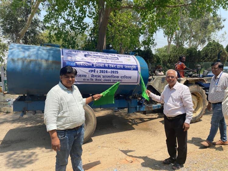फोटो है, 25 निरसा 5 में हरी झंडी दिखाते अधिकारी. मैथन. डीवीसी मैथन प्रबंधन ने सीएसआर के तहत भीषण गर्मी में आसपास के गांवों में जलापूर्ति को लेकर गुरुवार को पेयजल टैंकर रवाना किया. डीजीएम अनूप पुरकायस्थ, वरीय प्रबंधक (असैनिक) लोमस कुमार व सीएसआर के प्रबंधक डॉ कौशलेंद्र कुमार हरी झंडी दिखा कर टैंकर को रवाना किया. पोराडीहा, टूनापाड़ा, बड़जोड़, मंगलमारा, कालीमाटी, मेढ़ा टोला, गोगना, पोयलाडीह सहित 10 गांवों में टैंकर से रोजाना पानी पहुंचाया जायेगा. टैंकर के माध्यम से 10 जुलाई तक गांवों में पानी पहुंचाया जायेगा. मौके पर हिंदी सह जनसंपर्क अधिकारी अरविंद कुमार सिंह, मैथन डिवीजन के प्रबंधक (असैनिक) बंदन राय, उप प्रबंधक (असैनिक) राजेश कुमार, जेइ उत्पल साहा, ब्रजमोहन महतो आदि थे.