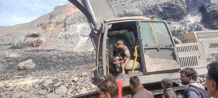 घटनास्थल पर दुर्घटनाग्रस्त मशीन.Dhanbad News: अग्नि प्रभावित हिल टॉप आउटसोर्सिंग परियोजना में काम के दौरान हुई घटना. घायल ऑपरेटर बेहतर इलाज के लिए बोकारो रेफर.