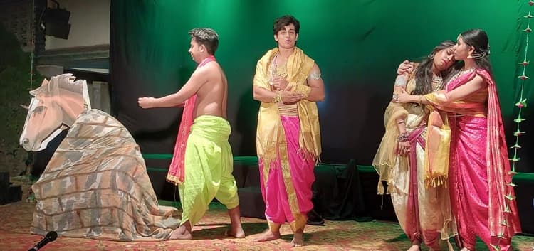 कला निकेतन के संयुक्त तत्वावधान में गुरुवार को भूली के नीरज मेमोरियल स्कूल में महाकवि कालिदास रचित ””विक्रमोर्वशीयम्”” का पूर्णकालिक हिन्दी नाटक का मंचन शैब्या सहाय के निर्देशन में किया गया. मौके पर अतिथि के रूप में किरण सिन्हा, संस्था के मुख्य संरक्षक राजेन्द्र कुमार, पिंकी पासवान, रंजीत कर्मकार, संजय बक्शी, पूर्व पार्षद रंजीत कुमार बिल्लू, दुलारचंद यादव आदि मौजूद थे. नाटक शृंगार, वीर, हास्य रस व नृत्य – संगीत से ओतप्रोत था. इसमें कलाकारों ने प्रेम प्रसंग की प्रगाढ़ता को जबरदस्त तरीके से मंचन किया गया. नाटक के अंत में 40 लोगों को नाट्य श्री अवार्ड व 12 लोगों को गोल्ड मेडल देकर सम्मानित किया गया. कलाकारों में शैव्या सहाय, आकाश सहाय, दीपक पंडित, क्रान पासवान, नित्या सहाय, प्रियंका कुमारी, इश्तेयाक अहमद, धर्मवीर कुमार, राकेश कुमार, कुलसुम, रिया कुमारी, सोनम कुमारी, प्रेम कुमार, अनुराधा श्रीवास्तव, सतीश कुमार, निशांत कुमार आदि शामिल थे.यात्रियों की सुविधा के लिए धनबाद स्टेशन पर रखा गया घड़ा : धनबाद.