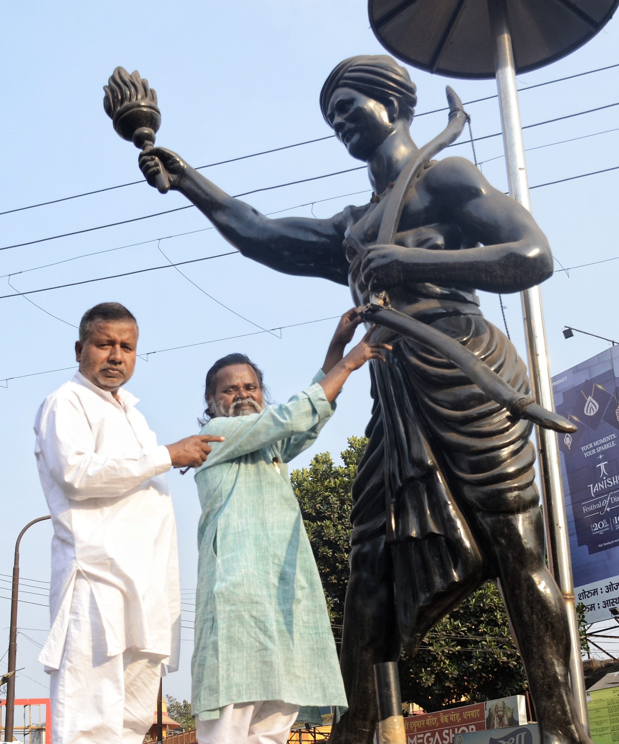 बैंक मोड़ में स्थापित भगवान बिरसा मुंडा के प्रतिमा का धनुष क्षतिग्रस्त हो गया है. वहीं तरकश से एक तीर भी गायब है. इस घटना की भगवान बिरसा मुंडा स्मारक समिति के संयोजक महादेव हांसदा ने कड़ी निंदा की है. उपायुक्त से घटना को अंजाम देने वाले असामाजिक तत्वों पर कठोर कार्रवाई करने की मांग की है. इधर प्रतिमा के साथ छेड़छाड़ का मामला प्रकाश में आने के बाद बैंक मोड़ थाना प्रभारी लव कुमार, नगर निगम के इंस्पेक्टर अनिल कुमार जांच करने पहुंचे. अनिल कुमार ने बताया कि अबतक के जांच में यह सामने आ रही है कि इसमें किसी शरारती तत्वों का हाथ हो सकता है. क्षतिग्रस्त धनुष की मरम्मति को लेकर नगर आयुक्त ने निर्देशित कर दिया है. जल्द ही धनुष की मरम्मति करायी जायेगी.