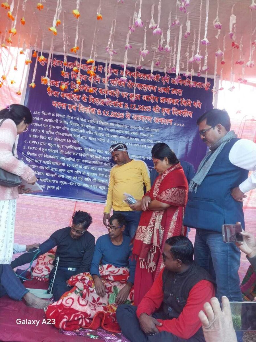 Dhanbad News : अपनी सेवा बहाली को लेकर महुदा इंटर कॉलेज के बर्खास्त प्राध्यापक व एक चतुर्थवर्गीय कर्मी का कॉलेज के मुख्य द्वार पर मंगलवार से शुरू अनशन बुधवार को दूसरे दिन भी जारी रहा. अनशनकारियों का स्वास्थ्य बिगड़ने की सूचना पाकर दोपहर को स्वास्थ्य विभाग की मेडिकल टीम जांच करने पहुंची. जांच में दोनों का ब्लड प्रेशर लो पाया गया. वहीं दोनों ने अपनी कमजोरी की शिकायत की. इधर महुदा क्षेत्र के कई लोगों ने पहुंचकर अपना समर्थन दिया. उनमें निर्मल कुमार रवानी, प्रदीप सिंह, भोला प्रमाणिक, गोखुल कुंभकार, रमेश महतो शामिल थे. अनशन पर बैठे बर्खास्त प्रो. सुरेश कुमार रजक ने कहा कि जब तक उन लोगों की सेवा बहाली नहीं होगी, तब तक आंदोलन जारी रहेगा. उन्होंने कहा कि शिक्षा विभाग या जिला प्रशासन की ओर से अभी तक कोई पदाधिकारी नहीं आये हैं.