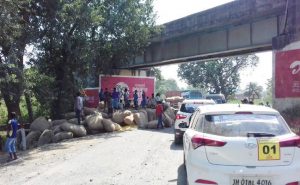 रेलवे क्रॉसिंग के पास फंसा ट्रक, सड़क पर आवागमन ठप