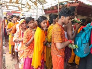 भादो मास के 11वें दिन 56 हजार कांवरियों ने की स्पर्श पूजा प्रतिनिधि, बासुकिनाथ. भाद्रपद माह के कृष्ण पक्ष की द्वादशी तिथि को भादो मेला के 11वें दिन बाबा नागेश के दरबार में भक्तों की भारी भीड़ उमड़ी. दर्शनों के लिए मंदिर में श्रद्धालुओं की भीड़ जुटी. पूजा के बाद मंदिर गर्भगृह के कपाट कांवरिया श्रद्धालुओं के लिए खोल दिये गये, जिसके बाद 56 हजार कांवरियों ने जलाभिषेक किया. सुबह तीन बजे से श्रद्धालु कतारबद्ध होकर जलाभिषेक कर रहे थे. शाम पांच बजे विश्राम पूजा के लिए जलाभिषेक रोका गया. गंगाजल चढ़ाकर भक्तों ने मनोकामनाएं मांगी. षोडशोपचार पूजन के बाद क्षणिक विश्राम हेतु कपाट बंद किए गए, फिर विश्राम पूजन के बाद कपाट खुलने पर जलाभिषेक श्रृंगार पूजा तक जारी रहा. शिवगंगा घाट व मेला परिसर कांवरियों से भरा रहा. महिला-पुरुष कांवरियों ने कतारबद्ध होकर पूजा अर्चना कर सुख समृद्धि की कामना की. कांवरियों की कतार शिवगंगा घाट, क्यू कॉम्पलेक्स, फलाहारी धर्मशाला, संस्कार मंडप होते हुए मंदिर प्रांगण में पहुंची. मंदिर परिसर बाबा के जयकारों से गूंज उठा. स्पर्श पूजा के बाद भक्तों ने मंदिर प्रांगण में आरती भी की. भादो मेले में अधिकारी सीसीटीवी से मंदिर एवं मेला क्षेत्र पर नजर रख रहे हैं. अधिकारियों ने गर्भगृह में कतारबद्ध श्रद्धालुओं को सुगमतापूर्वक जलार्पण कराया. 763 कांवरियों ने शीघ्रदर्शनम किया भादो मास की द्वादशी तिथि को शीघ्रदर्शनम के 763 टोकन की बिक्री हुई. श्रद्धालु मंदिर कार्यालय में 300 रुपये का रसीद लेकर शीघ्रदर्शनम गेट से मंदिर गर्भगृह में सुलभ जलार्पण किया. इस व्यवस्था से मंदिर प्रबंधन को 2 लाख 28 हजार 900 रुपये की आमदनी प्राप्त हुई. मंदिर सिंह द्वार से शीघ्रदर्शनम के श्रद्धालु मंदिर प्रांगण स्थित विशेष द्वार से मंदिर गर्भगृह में प्रवेश कर जलार्पण करते है. मंदिर प्रभारी सह बीडीओ कुंदन भगत, पुलिस निरीक्षक श्यामानंद मंडल सीसीटीवी के मदद से मंदिर व मेला क्षेत्र की गतिविधियों पर नजर बनाये रखा.