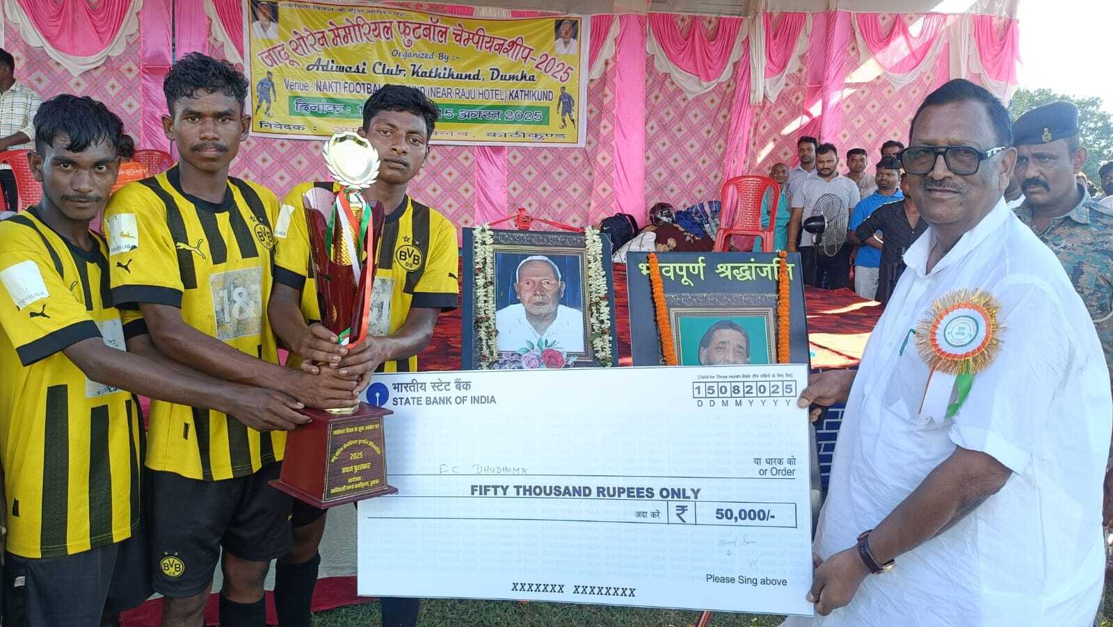 काठीकुंड. आदिवासी क्लब काठीकुंड द्वारा आयोजित तीन दिवसीय जादू सोरेन मेमोरियल फुटबॉल चैंपियनशिप का समापन स्वतंत्रता दिवस के अवसर पर नकटी खेल मैदान में हुआ. फाइनल मुकाबला एफसी छोकरा दुमदुमा और एफसी सारजेम बागान के बीच खेला गया. सीधे मुकाबले में दोनों टीम 2- 2 गोल के साथ बराबरी पर रही. रोमांचक मैच का निर्णय पेनल्टी शूटआउट से हुआ, जिसमें दुमदुमा ने एक गोल दागकर खिताब अपने नाम किया. विजेता टीम एफसी छोकरा दुमदुमा को दुमका सांसद नलिन सोरेन ने 50 हजार रुपये नकदी व शानदार ट्रॉफी प्रदान की गयी. उपविजेता एफसी सारजेम बागान को विधायक आलोक कुमार सोरेन ने 30 हजार रुपये नकद और ट्रॉफी देकर सम्मानित किया. तीसरे स्थान पर रही रिगल मैदान, दुमका की टीम को जिला परिषद अध्यक्ष जॉयस बेसरा ने 10 हजार रुपये की राशि सौंपी. चौथे सेमीफाइनलिस्ट एफसी डाकोडीह को जादू सोरेन के परिवार की ओर से ग्राम प्रधान सह सांसद प्रतिनिधि जोन सोरेन, सनातन सोरेन और प्रवीर सोरेन द्वारा इनामी पारितोषिक दिया गया. फाइनल के मैन ऑफ द मैच सारजेम बागान के जर्सी नंबर-8 के खिलाड़ी विकास मुर्मू रहे. उन्हें जेएमएम प्रखंड अध्यक्ष अब्दुल जब्बार ने सम्मानित किया. मैच से पूर्व दिशोम गुरु और जादू सोरेन को श्रद्धांजलि अर्पित करते हुए दो मिनट का मौन रखा गया. इसके बाद विधायक व थाना प्रभारी ने किक मारकर समापन मुकाबले का आगाज कराया था. फाइनल मुकाबले के दौरान नकटी खेल मैदान में हजारों की संख्या में दर्शक मौजूद रहे. युवाओं और महिलाओं का उत्साह देखते ही बन रहा था. मौके पर जेएमएम के वरिष्ठ कार्यकर्ता गौरीशंकर भगत, मानवेल मुर्मू, रोशन मुर्मू, जीवनेश सोरेन, विमल सोरेन, सिमोन टुडू, बालकिशोर, सूरज समेत कई गणमान्य लोग उपस्थित थे.