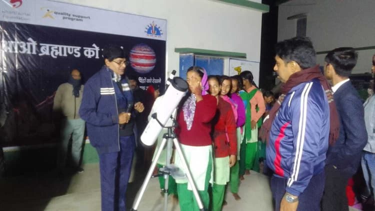 टेलीस्कोप का उपयोग करने खगोलीय पिंडों को खोजने के तरीके भी सिखाये गये संवाददाता, दुमका रानीश्वर प्रखंड के पीएम श्री उत्क्रमित उच्च विद्यालय कुमिरदहा में पहली बार छात्रों को ब्रह्मांड का अवलोकन करने का अनोखा अनुभव प्राप्त हुआ. विशेष कार्यक्रम का आयोजन स्कूल के एस्ट्रोनॉमी क्लब द्वारा किया गया, जिसमें एयरटेल फाउंडेशन ने टेलीस्कोप प्रदान कर छात्रों के खगोल विज्ञान के प्रति रुचि को प्रोत्साहित किया. सदस्यों ने शुक्र और बृहस्पति ग्रह का टेलीस्कोप के माध्यम से अवलोकन किया. छात्रों ने शुक्र ग्रह के विभिन्न चरणों, बृहस्पति ग्रह और चंद्रमा को देखकर गहरी उत्सुकता और उत्साह व्यक्त किया. छात्रों ने कहा यह पहली बार है जब उन्होंने टेलीस्कोप से ग्रहों को इतने करीब से देखा. यह एक अद्भुत अनुभव था. वहीं, एक अन्य छात्रा ने कहा शुक्र और बृहस्पति के बारे में हमने किताबों में पढ़ा था, लेकिन आज उन्हें अपनी आंखों से देख पाना बहुत रोमांचक था. कार्यक्रम के दौरान छात्रों को टेलीस्कोप का उपयोग करने और आकाश में खगोलीय पिंडों को खोजने के तरीके भी सिखाये गये. शिक्षकों ने शुक्र और बृहस्पति ग्रह के वातावरण, सतह और उनकी विशेषताओं पर जानकारी साझा की. आयोजन में जिला से सहायक कार्यक्रम पदाधिकारी श्याम सुंदर मोदक ने बच्चों को प्रोत्साहन करते हुए भारती एयरटेल फाउंडेशन के कार्य की सराहना की, बीइइओ एस्थर मुर्मू ने एस्ट्रोनॉमी क्लब के बच्चों के अभिनव प्रयास की सराहना करते हुए भारती एयरटेल फाउंडेशन को धन्यवाद दिया. बीपीओ मोहन ठाकुर ने इस तरह के कार्यक्रम के लिए धन्यवाद ज्ञापन दिया. आयोजन में प्रधानाध्यापक संयुक्ता कुमारी, सुशांत घोष, मलय, कंचन मंडल, भजन कुमार सिंह इत्यादि मौजूद रहे. कार्यक्रम न केवल छात्रों के लिए सीखने का अवसर था, बल्कि उनके खगोल विज्ञान के प्रति प्रेम को भी बढ़ावा देने वाला साबित हुआ. प्रधानाचार्य ने कहा कि ऐसे प्रयास छात्रों को विज्ञान के क्षेत्र में आगे बढ़ने के लिए प्रेरित करेंगे. कार्यक्रम में भारती एयरटेल फाउंडेशन से प्रवेश कुमार, राजर्षी चाकी तथा राहुल कुमार का महत्वपूर्ण सहयोग रहा.