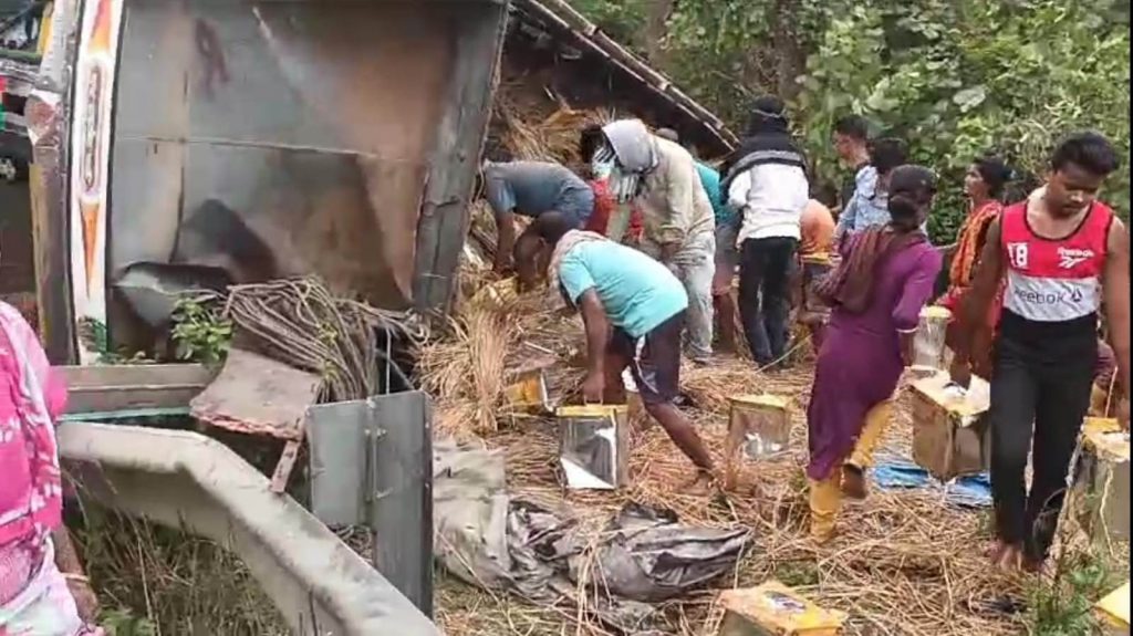रिफाइन तेल के टीन से भरा ट्रक पलटा, अधिकांश तेल लूट ले गये इलाके के ग्रामीण