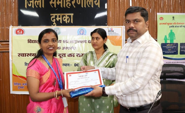 संवाददाता, दुमका जिले के उपायुक्त आंजनेयुलु दोड्डे की अध्यक्षता में आयुष्मान भारत के अंर्तगत चल रहे विद्यालय स्वास्थ्य व कल्याण कार्यक्रम के तहत आरोग्य दूतों को सम्मानित किया गया. सभी 10 प्रखंडों में पांच-पांच विद्यालयों के दो-दो आरोग्य दूतों को यानी कुल 100 आरोग्य दूतों को उपायुक्त ने कार्यक्रम में उनके उत्कृष्ट प्रदर्शन हेतु सम्मानित किया. कार्यक्रम की शुरुआत उपायुक्त आंजनेयुलु दोड्डे, सिविल सर्जन डॉ बीपी सिंह एवं डायट की प्रभारी प्राचार्य मधुश्री कुमारी ने किया. मौके पर सिविल सर्जन डॉ सिंह ने विद्यालय स्वास्थ्य व कल्याण कार्यक्रम के विषय में विस्तृत जानकारी दी. चलने से छात्र-छात्राओं के स्वास्थ्य को लेकर सतत पर्यवेक्षण तथा उसके सकारात्मक प्रभाव के बारे में बताया. उपायुक्त द्वारा कार्यक्रम में आये सभी आरोग्य दूतों को कार्यक्रम को और बेहतर करने का निर्देश दिया. कार्यक्रम में स्वास्थ्य विभाग से डीपीएम राकेश आनंद, डीएएम रवींद्र सिंह, जिला समन्यवक आरकेएसके शैलेश सिन्हा, क्षेत्रीय समन्वयक मृत्युंजय शांडिल्य, शिक्षा विभाग से डाइट सदस्य एवं सभी प्रखंड के आरोग्य दूत व कार्यकारी एजेंसी सी-3 से जिला समन्वयक कुन्दन सिंह उपस्थित थे.