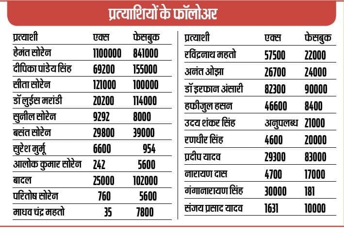 संताल परगना से चुनावी रण में उतरे मुख्यमंत्री हेमंत सोरेन के 1.1 मिलियन फॉलोअर एक्स पर तो 8.41 लाख फॉलोअर्स है, दीपिका पांडेय सिंह, डॉ लुईस मरांडी और सीता सोरेन भी लाख से अधिक फॉलोअर्स के साथ सोशल मीडिया पर खूब एक्टिव दिख रही हैं.