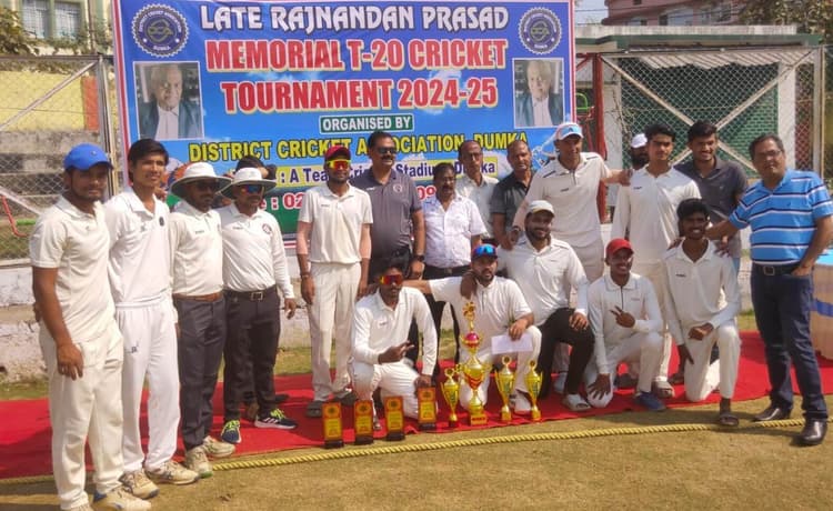 राजनंदन प्रसाद मेमोरियल टी-20 क्रिकेट टूर्नामेंट का फाइनल संपन्न पांच ओवर में ही एक विकेट खोकर एलएजे ने जीत लिया फाइनल मैच मैन ऑफ द मैच व बेस्ट बैट्समैन घोषित किये गये चैतन्य वीर संवाददाता, दुमका राजनंदन प्रसाद मेमोरियल टी-20 क्रिकेट टूर्नामेंट के फाइनल में एलएजे ने स्पोर्ट्स जॉन को नौ विकेट से पराजित कर शील्ड पर कब्जा जमाया. जिला क्रिकेट संघ के तत्वावधान में रविवार को एटीम क्रिकेट स्टेडियम में खेले गये मुकाबले में एलएजे ने टॉस जीत कर पहले क्षेत्ररक्षण करने का निर्णय लिया. बल्लेबाजी करते हुए स्पोर्ट्स जोन की टीम निर्धारित ओवर में सभी विकेट खोकर महज 97 रन पर ऑलआउट हो गयी. स्पोर्ट्स जोन की ओर से अमन सिंह के 28 और हर्ष सिन्हा ने 17 रन बनाये, जबकि एलएजे की ओर से पीयूष ने 03, चैतन्य, समीर और सुधांशु ने दो-दो विकेट लिया. जवाबी पारी खेलने उतरी एलएजे की टीम चैतन्य वीर के 12 गेंद में 42, सचिन कुमार मुंडा के 13 गेंदों में 33 और सुधांशु के पांच गेंदों में 20 रनों की बदौलत महज पांच ओवर में ही एक विकेट खोकर फाइनल मैच जीत लिया. मौके पर उपस्थित जिला क्रिकेट संघ के सचिव भास्कर अजीत सिंह, कोषाध्यक्ष सुरेश मोदी, संयुक्त सचिव उमेश कुमार रावत, सह सचिव विश्वजीत चटर्जी, सदस्य चंद्र किशोर सिंह, वरिष्ठ क्रिकेटर दिनेश कुमार सिंह ने फाइनल के विजेता व उपविजेता के अलावा मैच के मैन ऑफ द मैच चैतन्य वीर, मैन ऑफ द सीरीज और बेस्ट बॉलर सुधांशु वर्मा तथा बेस्ट बैट्समैन चैतन्य वीर को शील्ड व नगद पुरस्कार से सम्मानित किया. इस अवसर पर बड़ी संख्या में खेल प्रेमी दर्शन उपस्थित थे.