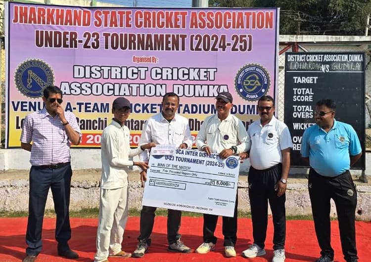 इंटर डिस्ट्रिक्ट अंडर-23 क्रिकेट टूर्नामेंट सुमित उरांव ने लगायी हैट्रिक संवाददाता, दुमका एटीम क्रिकेट स्टेडियम में राज्य क्रिकेट संघ के तत्वावधान में आयोजित इंटर डिस्ट्रिक्ट अंडर-23 क्रिकेट टूर्नामेंट के मैच में लोहरदगा ने गुमला को 146 रनों से पराजित किया. सोमवार सुबह गुमला के कप्तान यमुना कुमार झा ने टॉस जीता. पहले क्षेत्ररक्षण करने का फैसला किया. लोहरदगा टीम निर्धारित 50 ओवर के खेल में 34.01 ओवर में 208 रन बनाकर ऑलआउट हो गयी. लोहरदगा से सर्वाधिक 59 रन कप्तान रोनित आर्यन ने बनाया, जबकि सुमित उरांव ने 30 रनों का योगदान दिया. हिमांशु रंजन कुमार ने 22 रनों की पारी खेली. गुमला से गेंदबाजी करते हुए अभिषेक कुमार चौधरी ने 10 ओवर में 55 रन देकर चार विकेट प्राप्त किया, जबकि गौरव कुमार और अभय कुमार हर्ष को दो-दो विकेट मिले. जवाब में बल्लेबाजी करने उतरी गुमला की पूरी टीम 21.3 ओवर में 62 रन बनाकर ऑलआउट हो गयी. गुमला से कप्तान यमुना कुमार झा के अलावा कोई भी खिलाड़ी दहाई का आंकड़ा भी पार नहीं कर सका. लोहरदगा से गेंदबाजी करते हुए सुमित उरांव ने 2.3 ओवरों में आठ रन देकर चार खिलाड़ियों को पैवेलियन का रास्ता दिखाया, जिसमें शानदार हैट्रिक विकेट भी था. आदित्य कुमार झा ने आठ ओवर में चार मेडन देते हुए 17 रन खर्च किया. तीन खिलाड़ियों को आउट किया. तुषार मुदगल को भी दो सफलता प्राप्त हुई, जबकि जतिन कुमार पांडेय को एक विकेट मिला. सुमित उरांव को उनके शानदार ऑलराउंड प्रदर्शन के लिए जिला क्रिकेट संघ के संयुक्त सचिव अमित रंगराजन ने मैन ऑफ द मैच का पुरस्कार प्रदान किया. इस अवसर पर जिला क्रिकेट संघ के सभी पदाधिकारी व सदस्य उपस्थित थे.