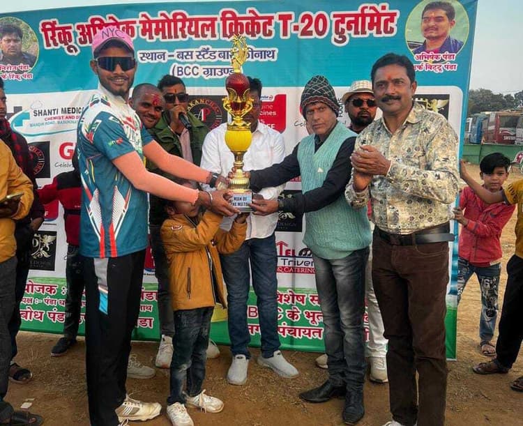 प्रतिनिधि, बासुकिनाथ बासुकिनाथ रिंकू अभिषेक टी-20 क्रिकेट टूर्नामेंट में सोमवार को मायावी बाबा-11 टीम और थार-11 टीम के बीच मुकाबला हुआ. जिसमें मायावी बाबा-11 टीम ने थार-11 टीम को 31 रन से हराकर सेमीफाइनल मुकाबले में प्रवेश किया. मायावी बाबा- 11 टीम ने टॉस जीतकर पहले बल्लेबाजी करने का फैसला किया. मायावी बाबा-11 टीम ने निर्धारित 20 ओवर में पांच विकेट के नुकसान पर 186 रन बनाए. लक्ष्य का पीछा करने उतरी थार- 11 की टीम संजू चटर्जी के 24 गेंद में 27 रन, विपिन कुमार के 26 गेंद में 43 रन, कालू कुमार के 31 गेंद में 44 रन एवं अंकित कुमार के 13 गेंद में 17 रन की बेहतरीन पारी के बावजूद निर्धारित 20 ओवर में छह विकेट के नुकसान पर 155 रन में सिमट ग;यी. मायावी बाबा- 11 टीम के बल्लेबाज मोहम्मद वाहिद को शानदार बल्लेबाजी करने के लिए मैन ऑफ द मैच का पुरस्कार दिया गया. अतिथि उमेश पंडा, कुमोद पंडा, मनोज पंडा, पिंकू पंडा के द्वारा खिलाड़ी को बेहतर प्रदर्शन करने के लिए पुरस्कार दिया गया. मैच में अंपायरिंग राहुल नाग एवं अनिल राव ने किया. इस टूर्नामेंट के सफल आयोजन में आयोजक समिति के सदस्य एवं बासुकिनाथ बीसीसी के पूर्व खिलाड़ी व बड़ी संख्या में स्थानीय ग्रामीण व खेलप्रेमी सहयोग कर रहे हैं.